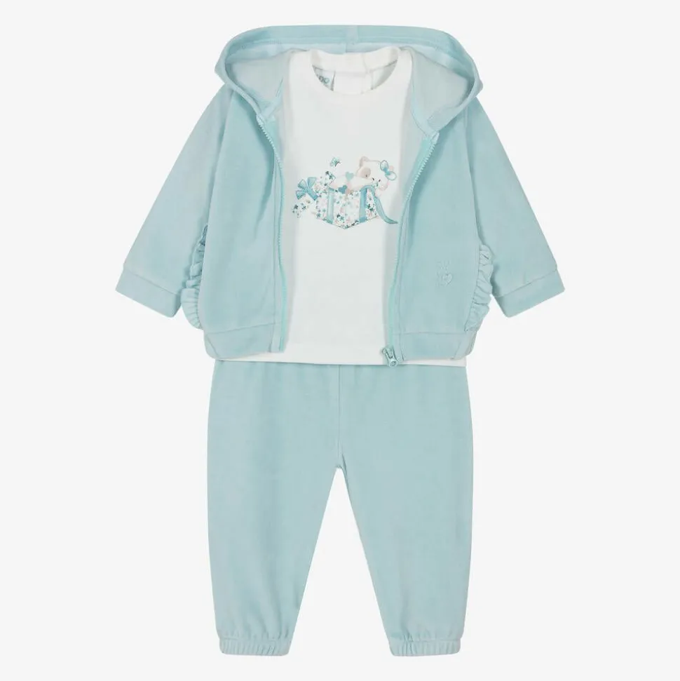 A lovely aqua blue cotton tracksuit set for baby girls by iDO Mini. Made from super soft velour, the zip-up hoodie has pretty frilled detailing and a tonal embroidered bunny rabbit motif for a sweet finish. The coordinating joggers have a delightful bow trim on the comfortable elasticated waist. Printed with a cute 'cate opening a present' design on the chest with subtle shimmery details, the white long-sleeved jersey top fastens with poppers on the back.