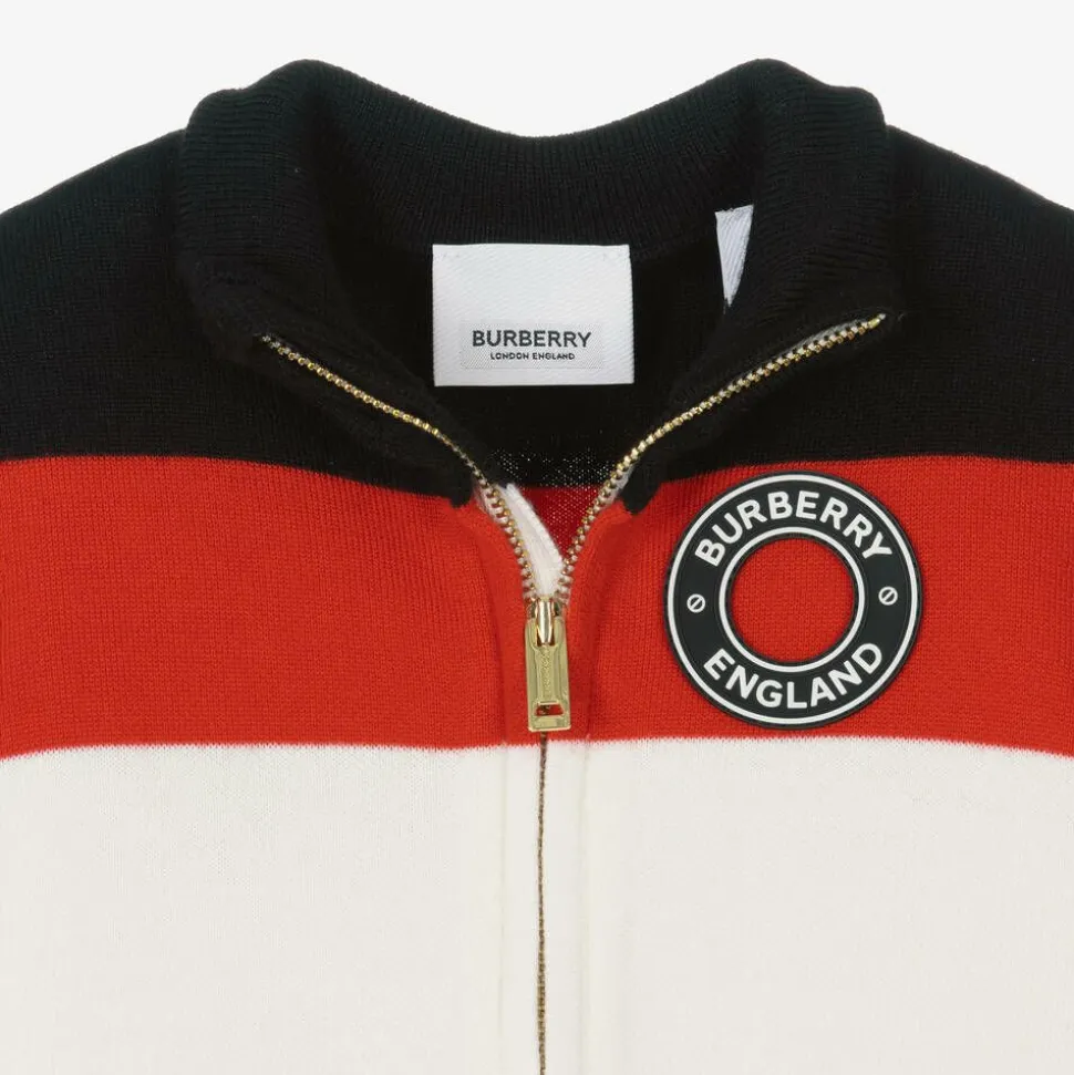 Luxury Merino wool dress for baby girls by Burberry, styled in the designer's classic Icon stripe. Featuring bold colours of ivory, beige, red and black, this warm and stylish sweater dress has a funnel neck with zip fastening and a silicone stamp logo at the chest. Responsibly sourced wool.