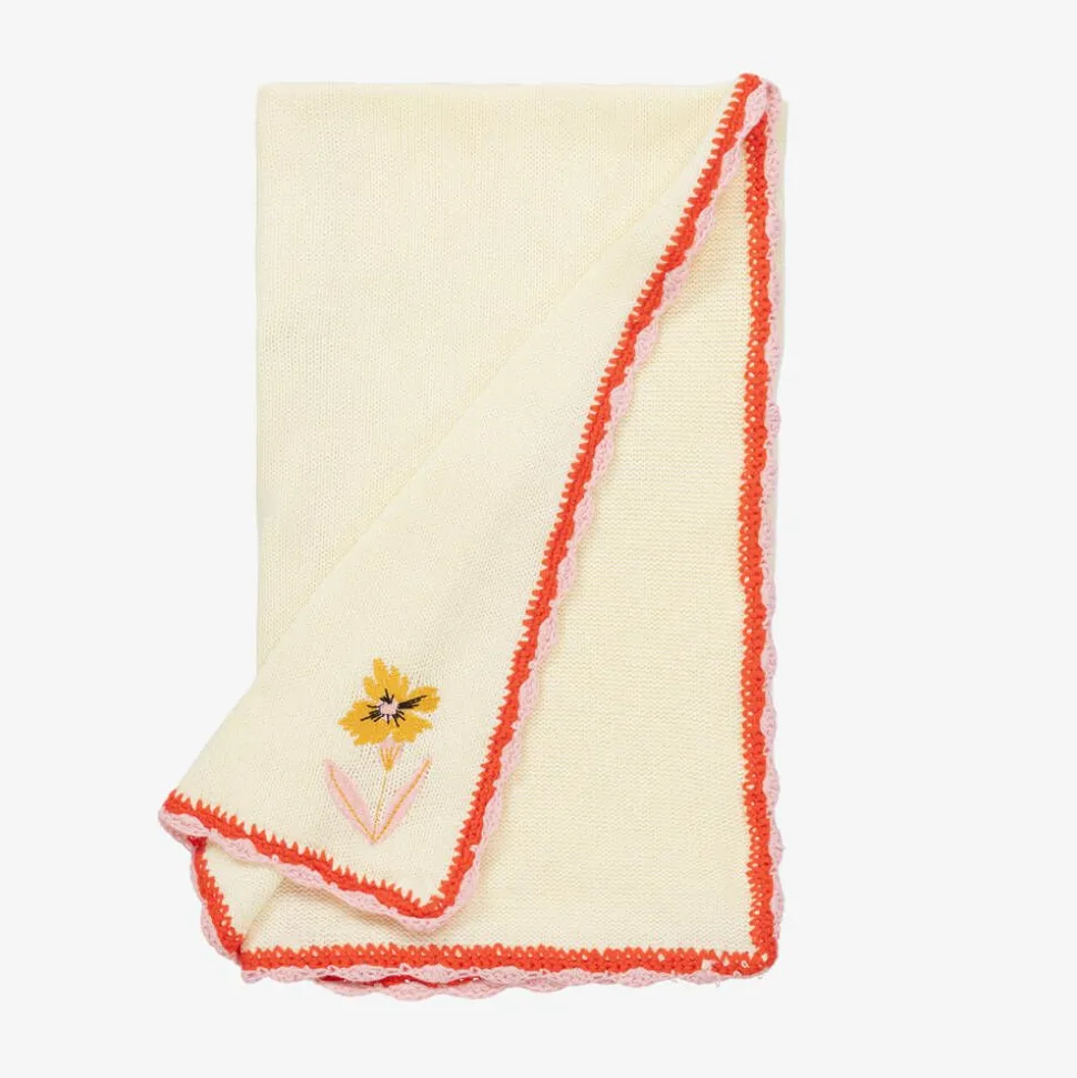 A pretty ivory shawl for baby girls by Powell Craft, made in a wonderfully soft cotton knit. Decorated on the front with colourful butterfly appliqués and flowers, this charming piece has a red and pink knitted trim around the edge. Ideal for keeping baby warm and cosy, it also makes a lovely addition to your little one's nursery.
