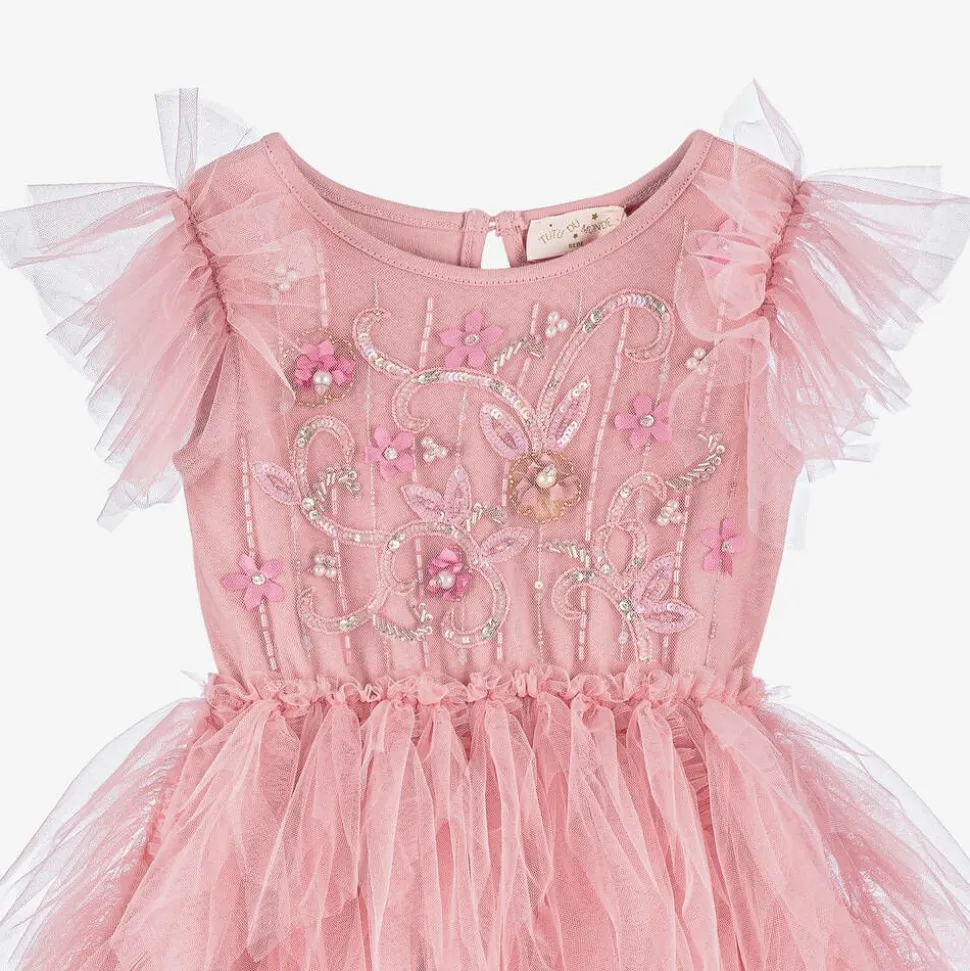 Pretty pink dress for baby girls by Tutu du Monde, hand-crafted in the finest tulle. The jersey bodice is hand-embellished with sparkling beads, faux pearls and tulle flower decorations for a beautiful look. Statement volume is created by the fabulous tutu skirt. Lined for comfort, it fastens with a pearlised keyhole button on the back. To complete the look, it comes with comfortable, elasticated knickers. Items are made to last and become more lovely with wear as slight fading and fraying edges adds to their charm.