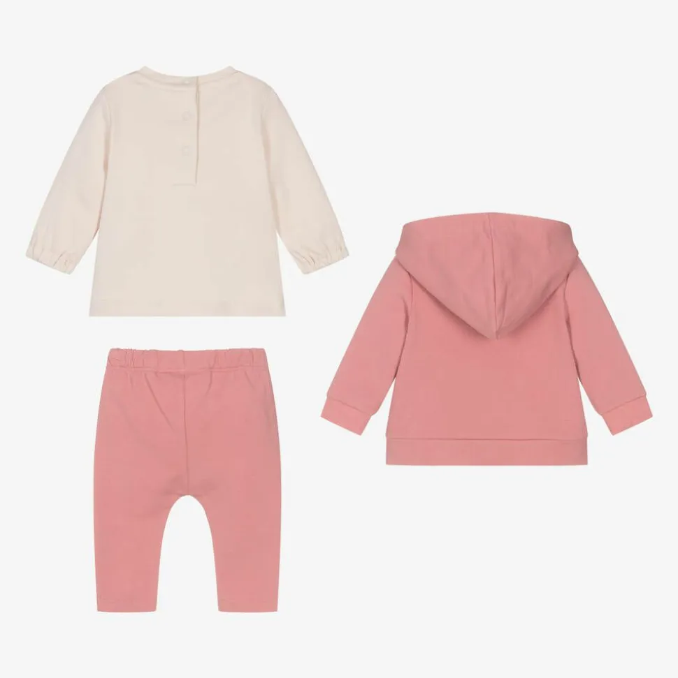 Pink tracksuit set for baby girls by iDO Mini, made in soft cotton jersey with a cosy fleecy inside. The long-sleeved top has an adorable hedgehog printed on the front, with chiffon and ribbon bow detailing. Fastening with poppers on the back, it is printed with the phrase 'piccola cosi' ('so small') and has gently elasticated cuffs. The zip-up hoodie has sweet bow trims and an embroidered bunny rabbit for a cute finish. Simply styled, the coordinating joggers have a comfortable elasticated waist.
