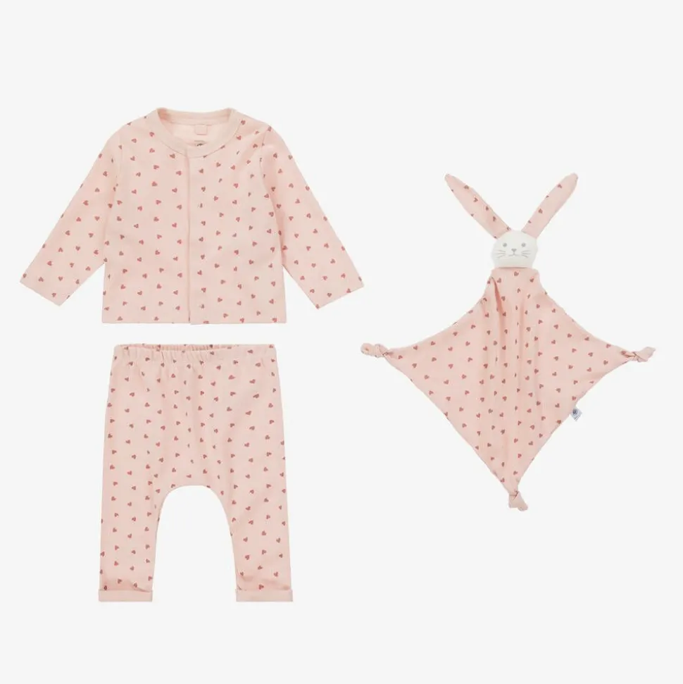 Pink trouser set for baby girls by French brand Petit Bateau, made in soft organic cotton jersey. Patterned with romantic love hearts, the round neck top has long sleeves and easy popper fastenings on the front. Matching trousers have a comfortable elasticated waist and turned-up cuffs. An adorable rabbit dou dou, with floppy ears and knotted corners, completes this lovely three-piece set.