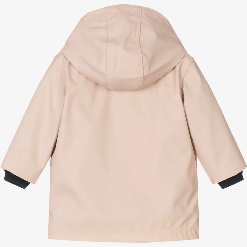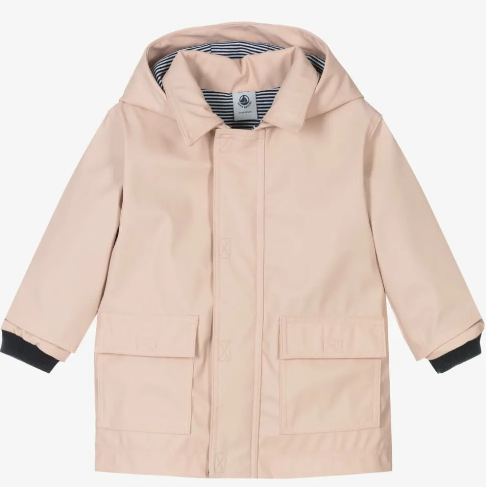 Pale pink hooded raincoat for baby girls by Petit Bateau, with a navy blue and white milleraies striped cotton jersey lining. Smooth and water repellent, it secures with a zip behind a velcro-fastening placket and has navy blue ribbed cuff inserts on the sleeves to keep the rain and cold out. There are pockets on the front with velcro fastening flaps. This garment is made of over 40% recycled material and over 10% cotton from organic farming.