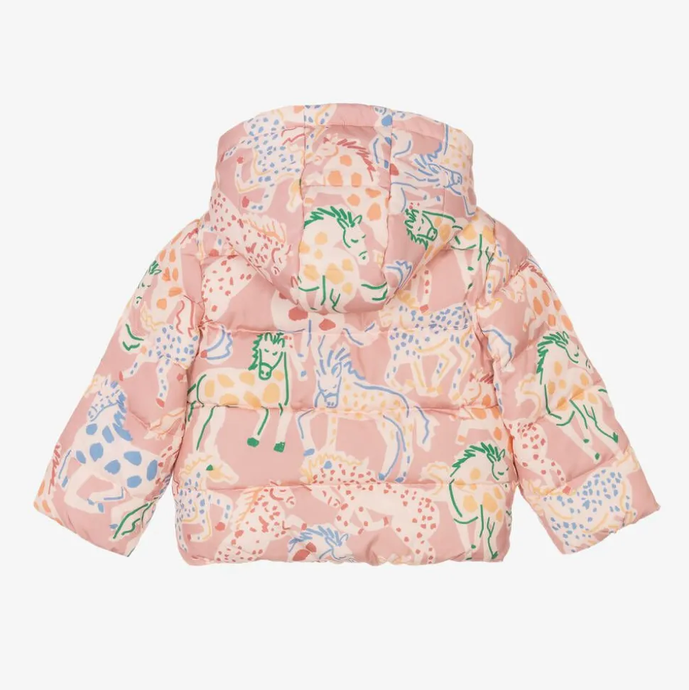 A pink puffer jacket for baby girls by Stella McCartney Kids, made in gently padded, recycled fabric. Patterned with a fun and playful horse design, this cosy jacket is lined in beautifully soft fleece for additional warmth. There are useful pockets and a zip fastening on the front and the hood can be easily detached for an alternative look. The Stella McCartney fit can be quite small so choose a size up if you want room to grow.