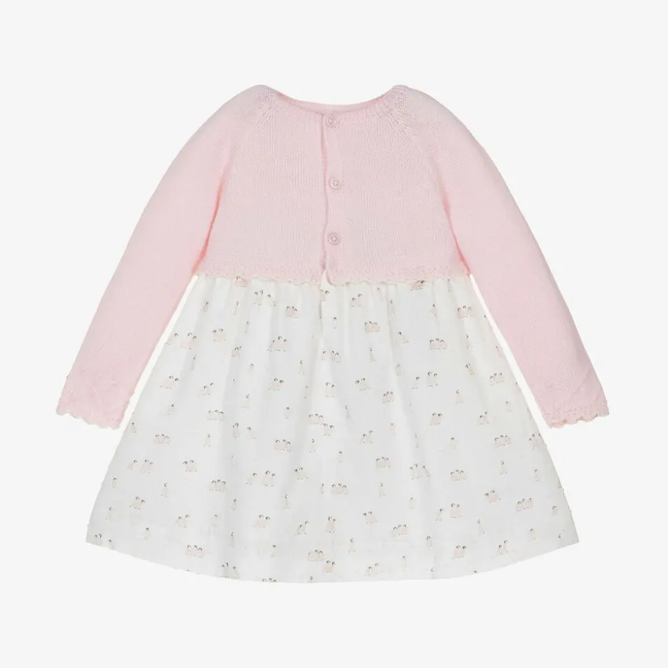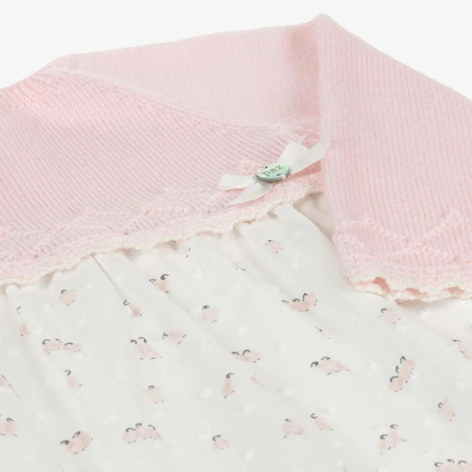 An adorable pink and ivory dress for baby girls by Paz RodrÃguez. Softly knitted in extra fine Merino wool, the long-sleeved bodice has diamond pattern and scalloped lace-knit trims. The Spanish brand's mother-of-pearl logo charm and grosgrain bow can be seen on the front and there are button fastenings on the back. Completing the charming style, the lined plumeti cotton skirt is patterned with cute pink penguins.