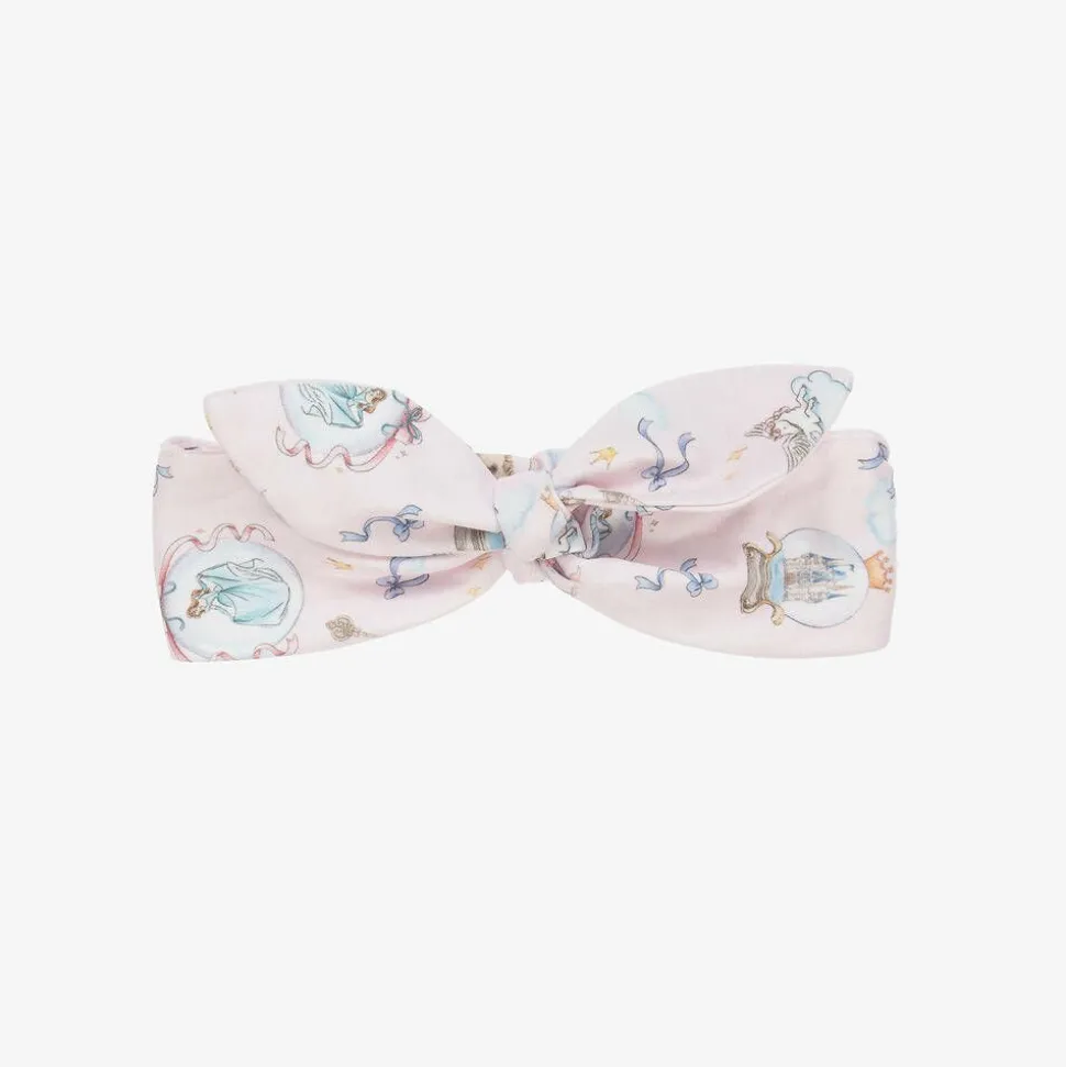 Pale pink headband for baby girls by My Little Pie, with a charming fairy tale princess and castle print. Made in soft organic Supima cotton jersey, it is comfortably elasticated at the back, with a sweet bow detail on the front.