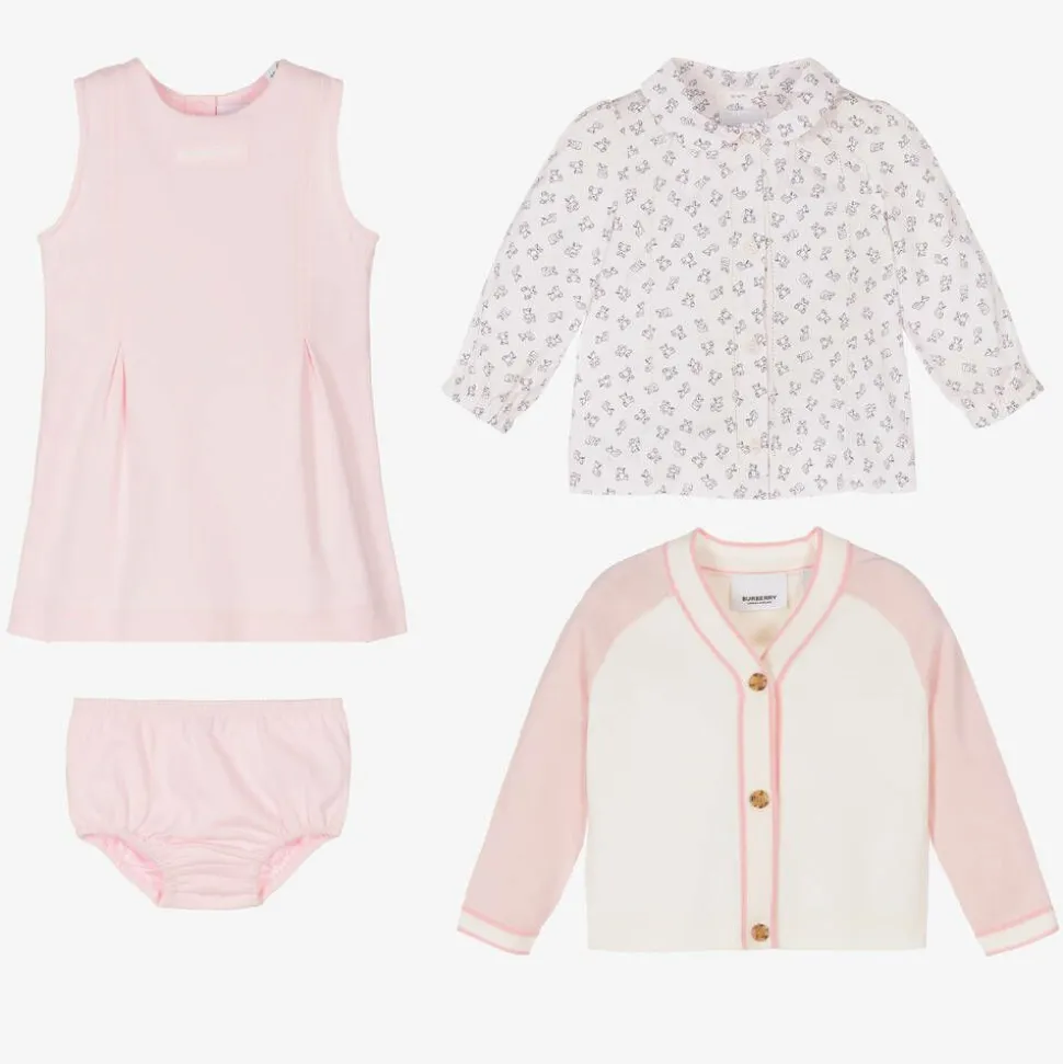 So lovely for baby girls, a wonderful pink and ivory gift set from luxury designer Burberry. Soft and lightweight, the pale pink cotton poplin blouse features a round collar, delicate cut-out details and an adorable pink and black Thomas Bear pattern. Finely knitted in soft wool, the ivory cardigan has dusky pink raglan sleeves, tortoiseshell buttons and a black and ivory bouclé Thomas Bear appliqué on the back. The pink sleeveless dress is made is stretchy, mid-weight cotton jersey, with a white box logo print and darts for a pretty silhouette. Matching pink jersey knickers complete this lovely set. Presented in a branded box, this outfit would make a beautiful gift.