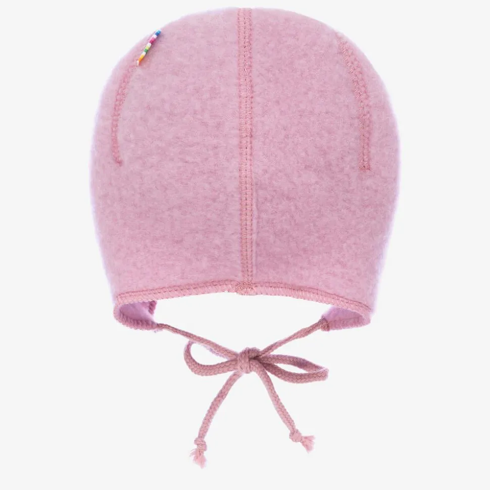 Soft dark pink felted Merino wool bonnet for baby girls by Joha, fastening easily with ties under the chin.