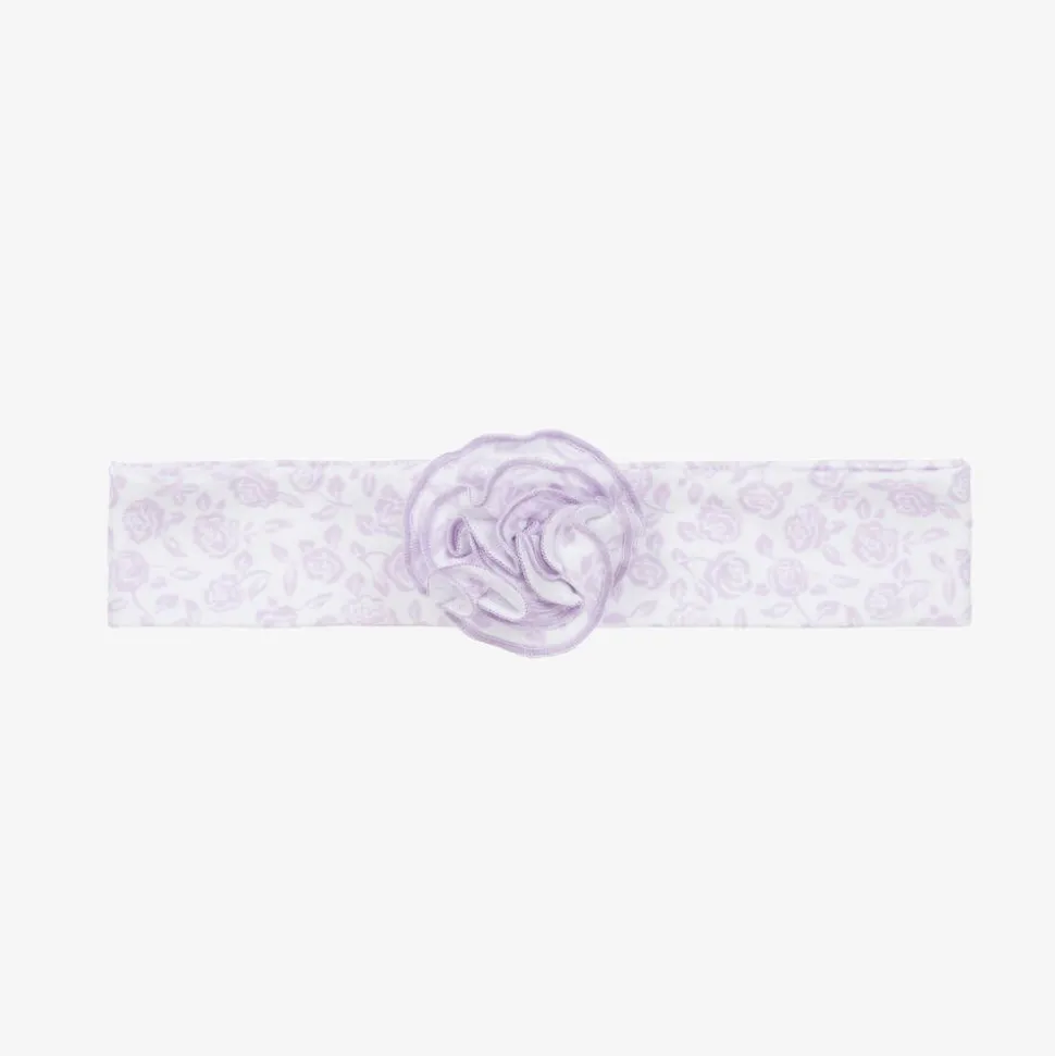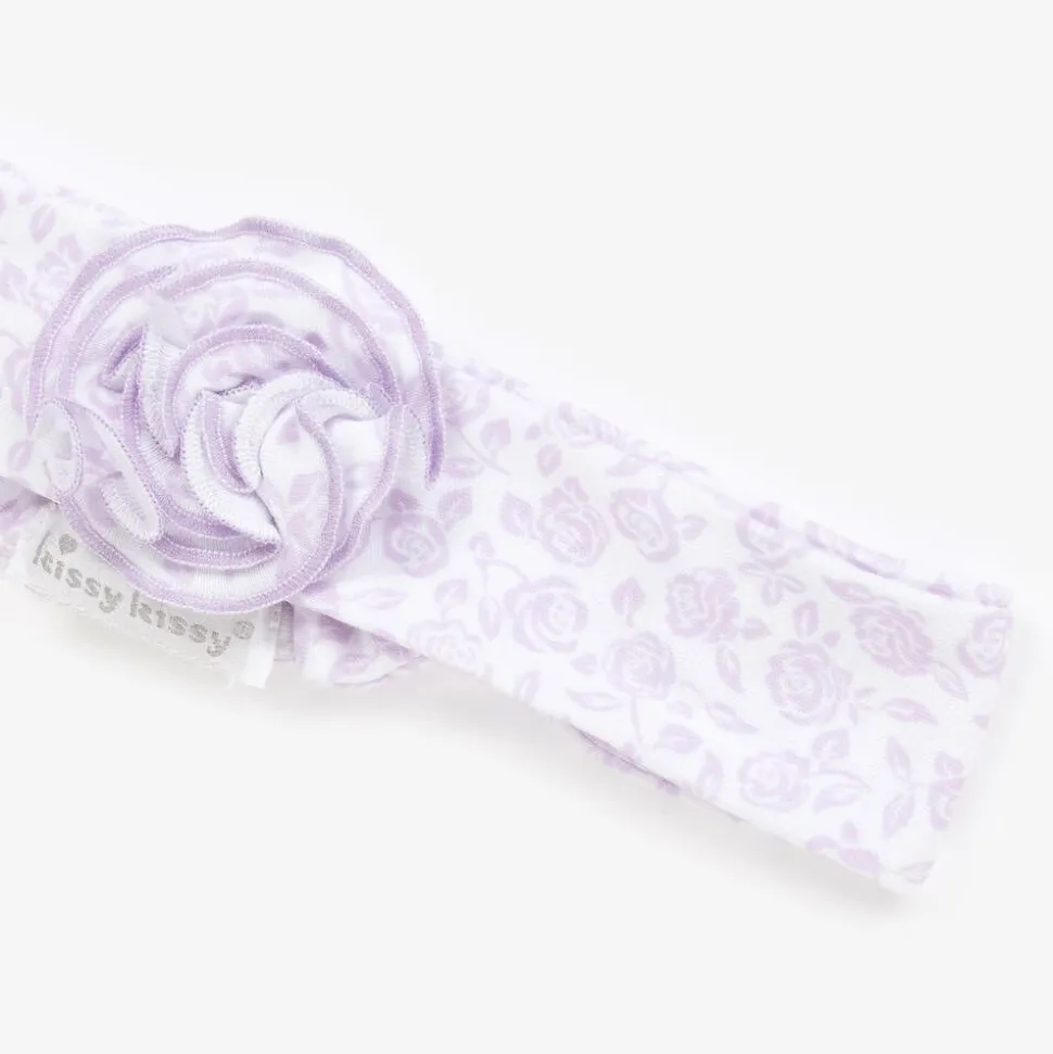 A sweet headband for baby girls by Kissy Kissy, patterned in lilac purple flowers on a white background. Gently elasticated at the back, it is made in super soft Pima cotton jersey, with a pretty ruffle flower decoration on the front.