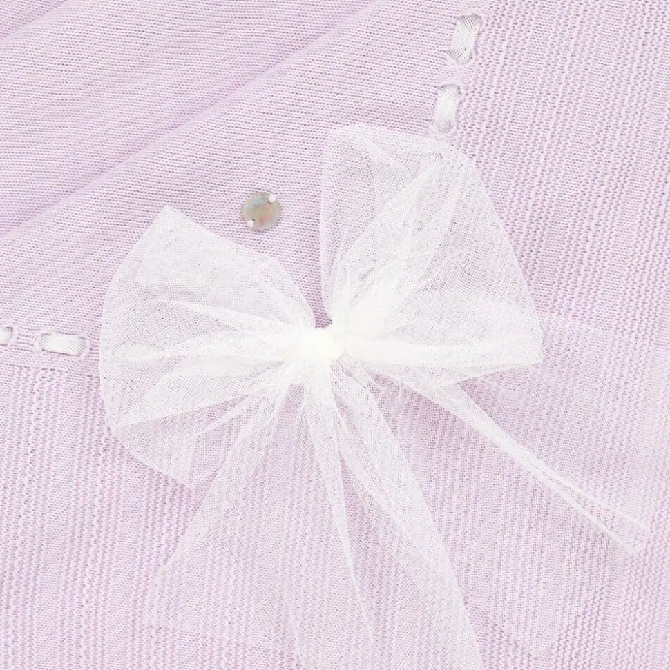 Lovely lilac purple blanket for baby girls by Spanish brand Artesania Granlei, with a large, white tulle bow in one corner and a matching tulle trim interlaced around the border. Made in a soft, lightweight knit, it has a mother-of-pearl logo charm sewn in one corner and is ideal for use in the nursery or for presenting baby to family and friends.
