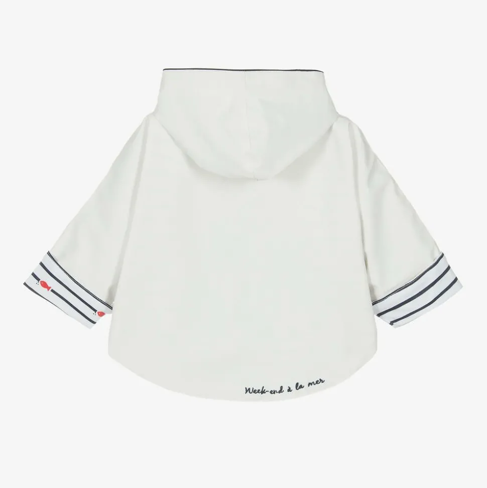 White hooded rain cape for baby boys and girls by French brand, Week-end à la mer. Water-resistant, it has a soft jersey lining patterned with the designer's signature blue and white Breton stripes and sweet red fish. There is a rubberised red fish logo on the chest, a navy blue embroidered logo on the back hem and a fun red lobster appliqué on one of the striped front pockets. It fastens with a zip on the front and poppers on the sides.