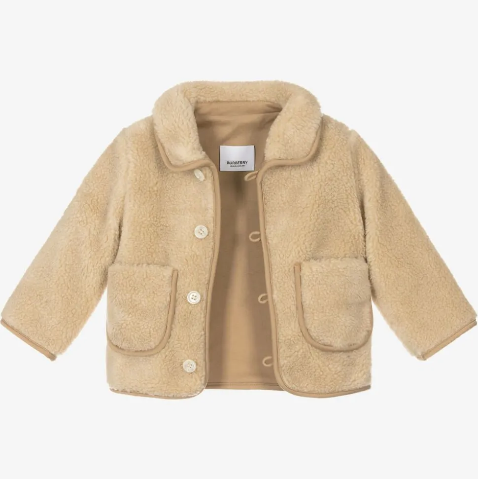 Adorable jacket for baby boys and girls by luxury British label Burberry, made in soft and warm sherpa fleece. This cosy design features a soft cotton jersey lining and trim, front patch pockets and toggle button fastenings. To complete the designer look, it has the brand's Vintage beige check trim under the collar and a gorgeous Thomas Bear appliqué on the back in white bouclé with black embroidery detail.