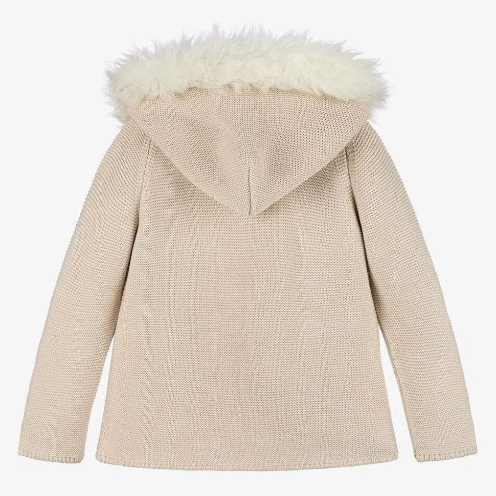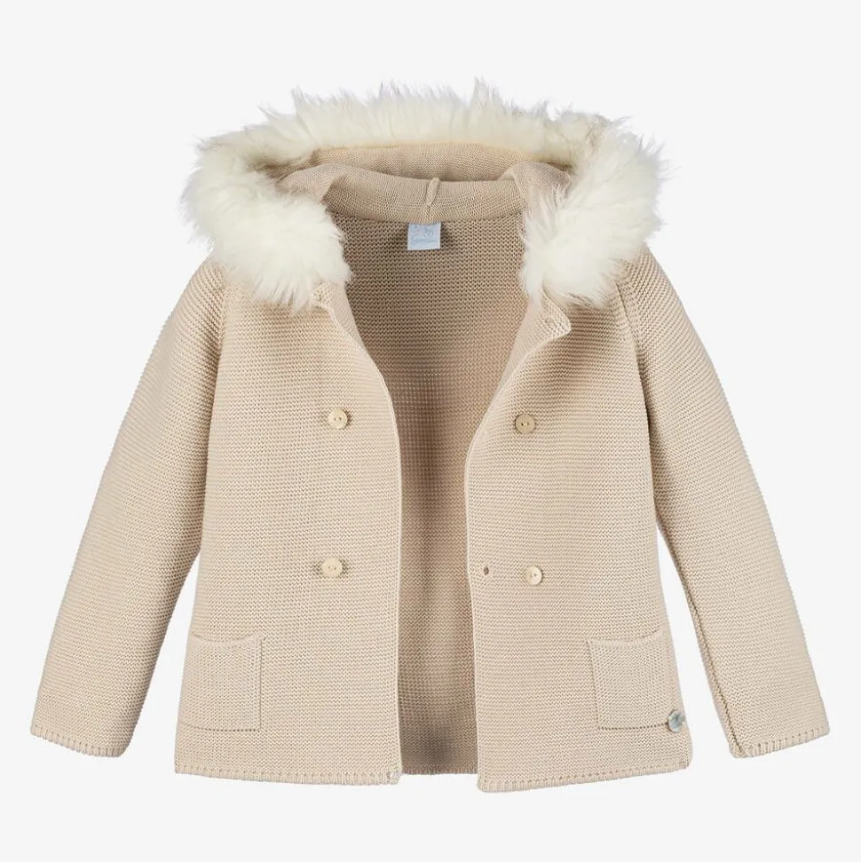 A charming beige coat for boys and girls by ArtesanĂa Granlei, made from a soft knit. In a simple double-breasted style, it fastens with pearlescent buttons on the front and has an ivory faux fur trim around the hood for added cosiness. It has sweet patch pockets and is stitched with a faux mother-of-pearl logo charm for a touch of branding.