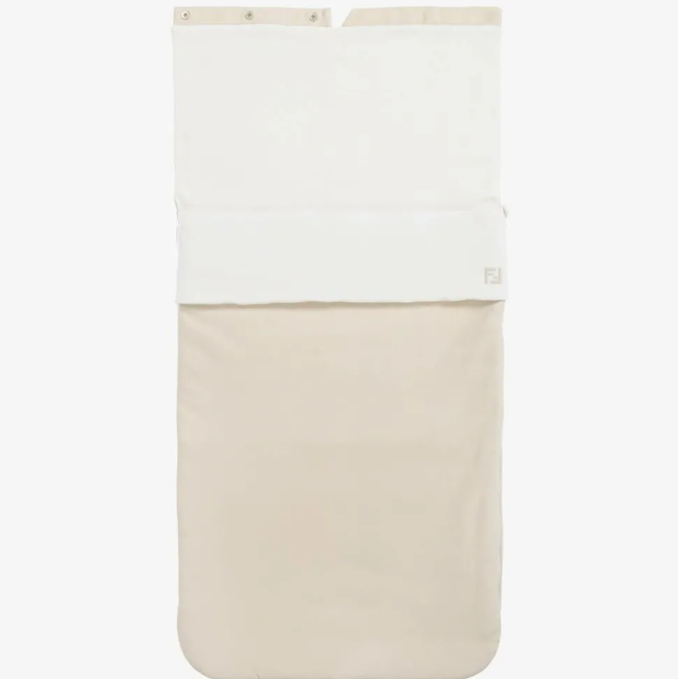 Present baby in this lovely beige and white padded nest for baby boys and girls, by Italian luxury designer Fendi. Made in soft cotton jersey, it has delicately embroidered FF logos for subtle branded touches. It fastens easily with a zip along the side and bottom, helping to easily get baby in and out. The popper-fastening hood can be unfastened and laid flat, ideal for allowing extra room as they grow. The length is adjustable with poppers on the back.