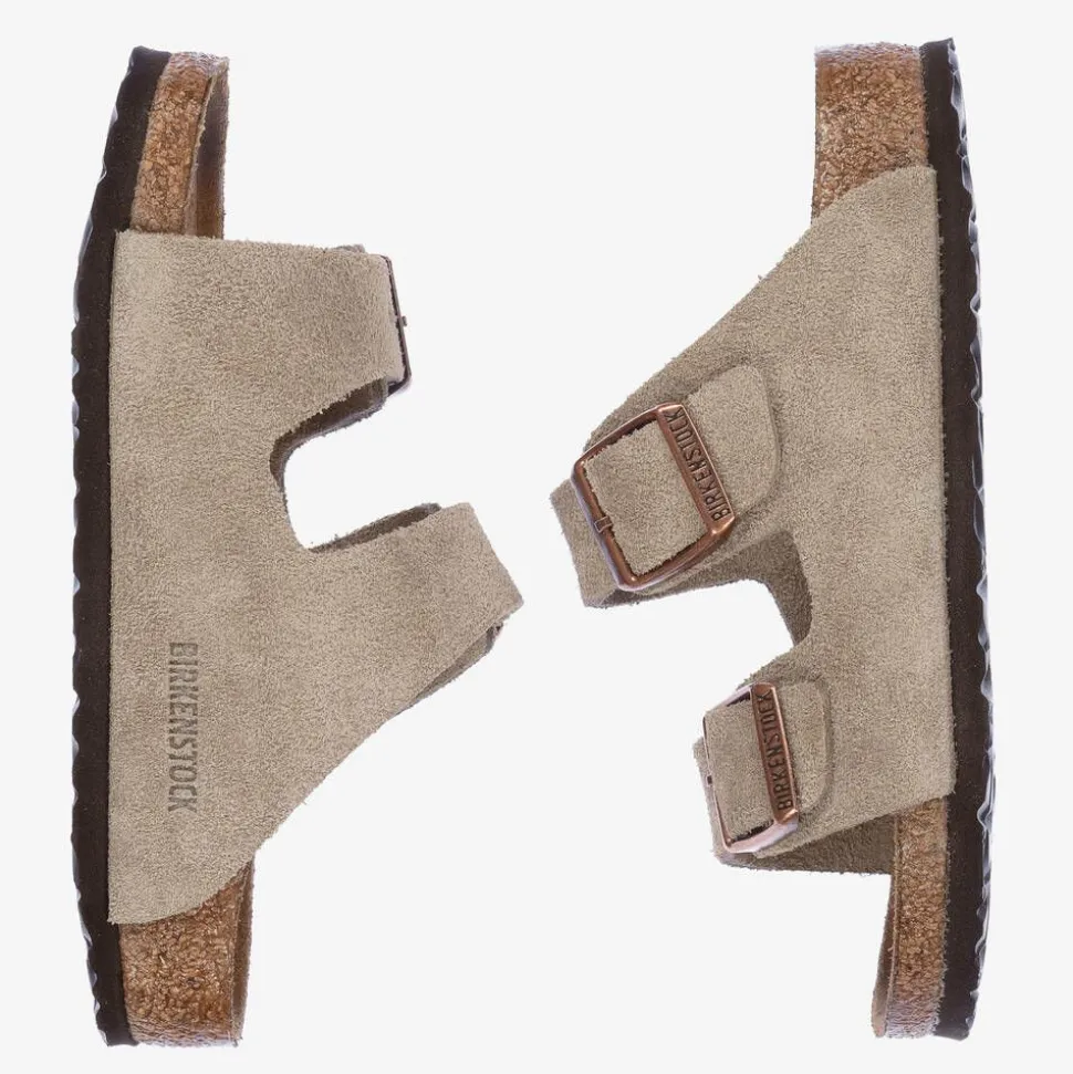 Timeless beige sandals for boys and girls by Birkenstock, made in the softest suede leather. These stylish sandals have copper branded buckle fastenings with adjustable straps. For comfort, the insole is made of soft suede with a cushioned natural cork footbed. They have contrasting dark brown slip-resistant EVA rubber outer soles.
