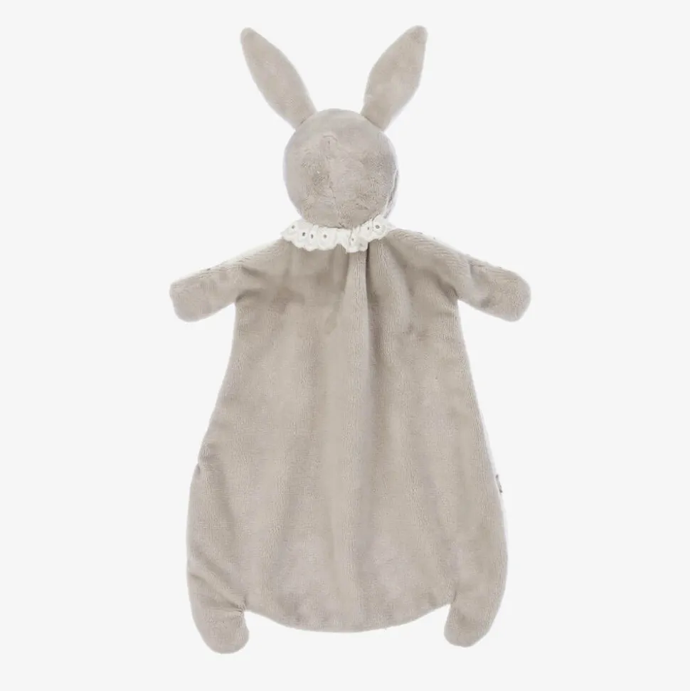 A sweet beige sleeping bunny comforter for baby boys and girls by Spanish brand Mayoral. Made in super soft velour with a cute rabbit print on the front, it has an embroidered bunny head with floppy ears.