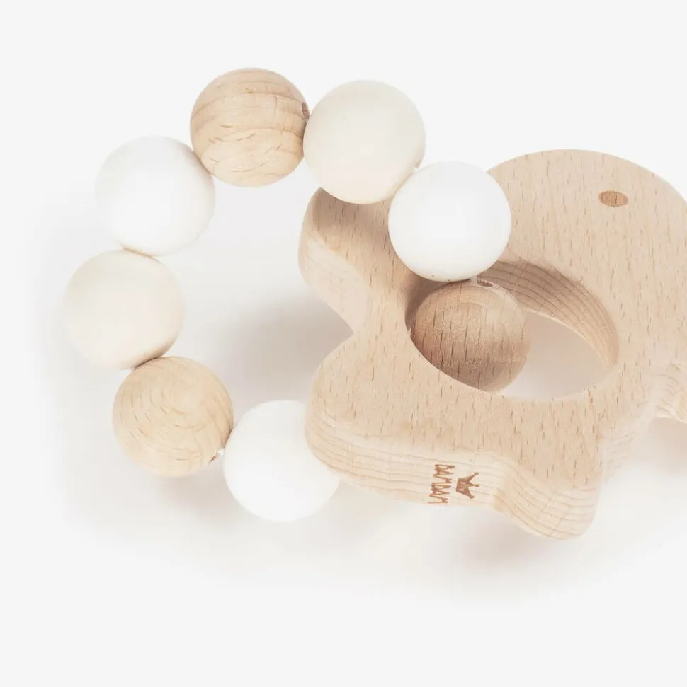A charming beige wooden teether toy for baby boys and girls by Bam Bam. The main section is shaped like a rabbit with a ring of wooden and silicone balls through the middle, making it easy for little hands to hold and gentle on sore gums.