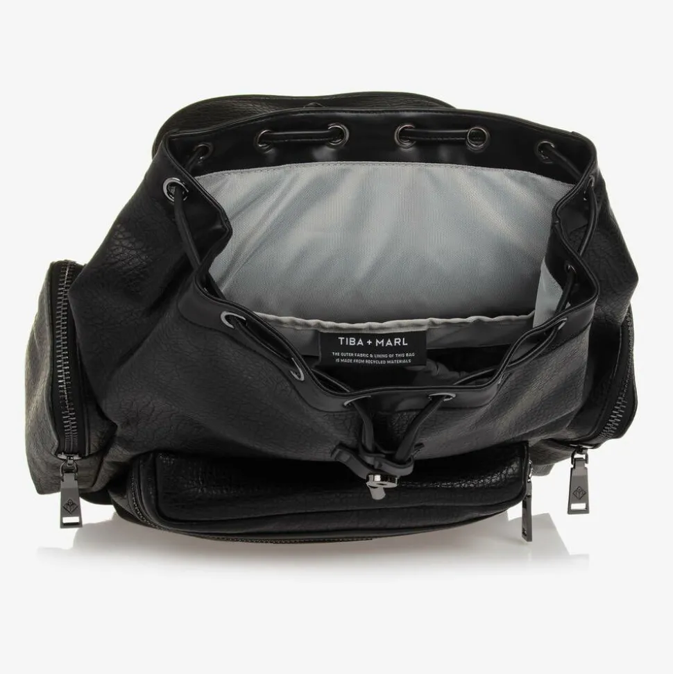 A smart black changing backpack by TIBA + MARL. It is made in smooth, recycled faux leather with a water-resistant and easy-to-wipe-clean, recycled woven lining. Inside the spacious main compartment, there is a useful laptop pocket, an insulated bottle holder, and an additional elasticated pocket. Stitched with a tonal logo patch, there is a large zipped pocket on the front and two zip-up pockets on the sides, one with insulated lining for extra practicality. Fastening with a drawstring and a magnetic clasp, the front flap has another zipped pocket for small essentials. The back panel and the adjustable straps are padded for added comfort and there is a top handle that can be easily hung on a hook. The D-rings on the sides can be attached to stroller clips (sold separately), and it comes with a zipped pouch and a padded changing mat.