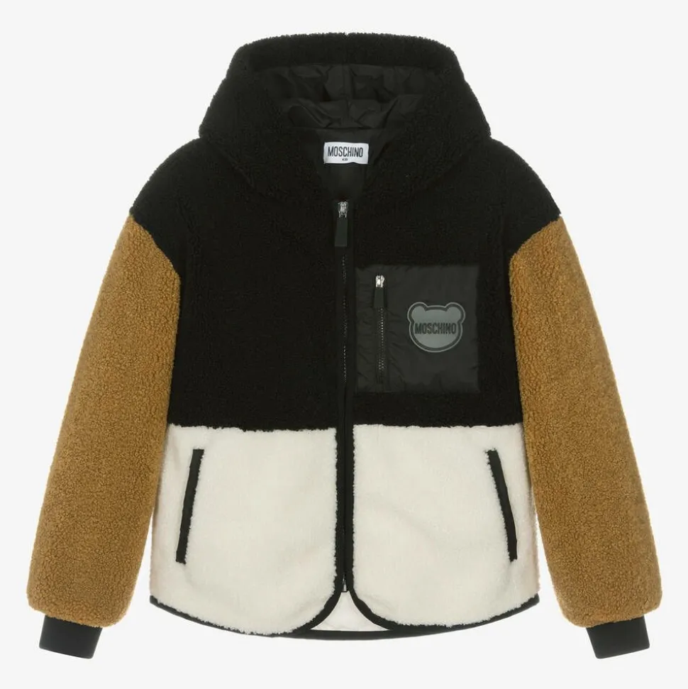 Cosy hooded fleece jacket for boys and girls by luxury Italian designer Moschino Kid-Teen, colour blocked in black, tan brown and ivory. For instant brand appeal, it has a rubberised Moschino Teddy Bear logo and a branded pull tab on the silky, zip-up chest pocket. The jacket is lined in silky satin for comfort and has warm, fleece-lined front pockets.