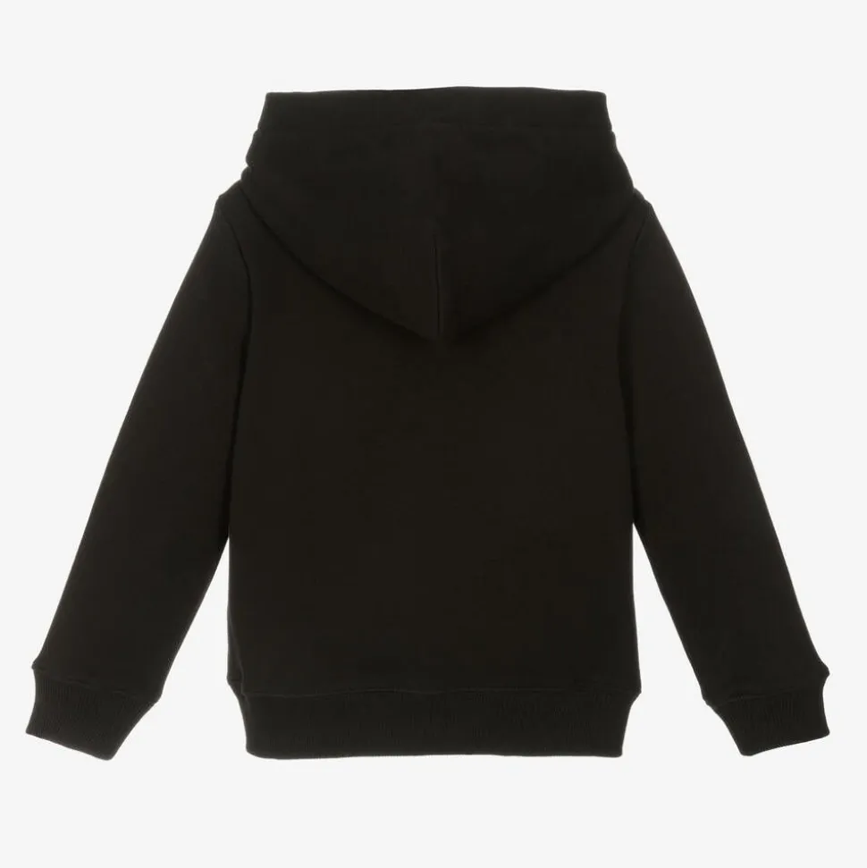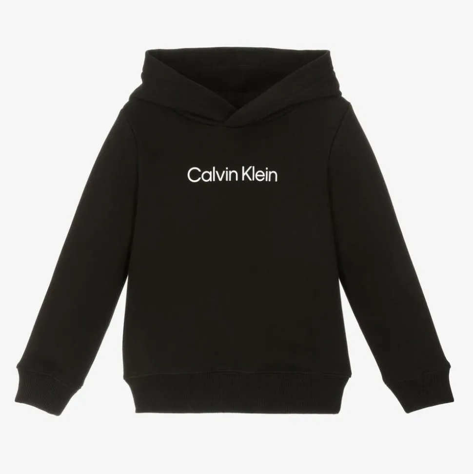 Casual black hooded sweatshirt for boys and girls from Calvin Klein. It is made in comfortable, mid-weight cotton jersey with a white logo print across the front for instant branded appeal.