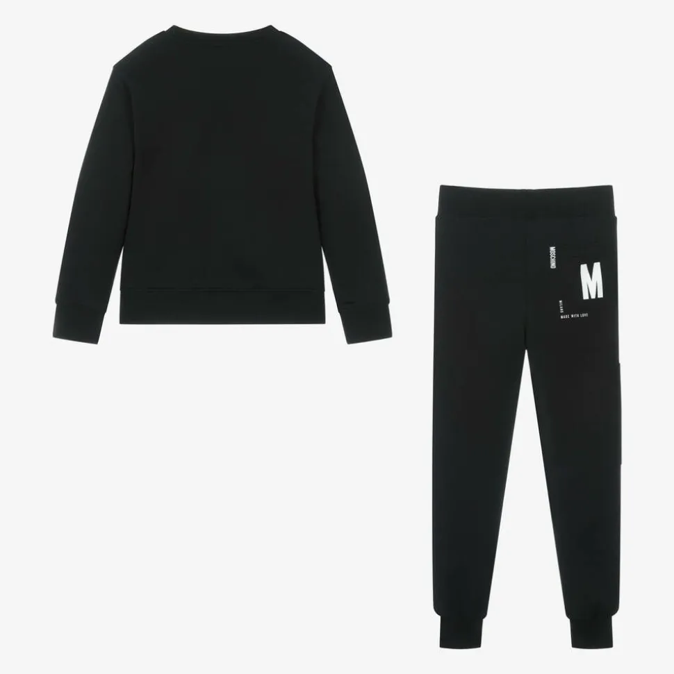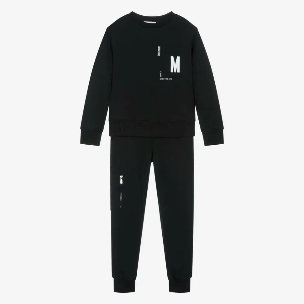 A cool black tracksuit for boys and girls by Moschino Kid-Teen, inspired by the adult collection. Made in comfortable cotton jersey, the sweatshirt has a white 'M' logo printed on the chest pocket with a slogan that reads 'Milano Made With Love'. The paired joggers feature the same branding on the back and a handy zip pocket on one leg. They have a ribbed waistband and slanted front pockets for everyday essentials.