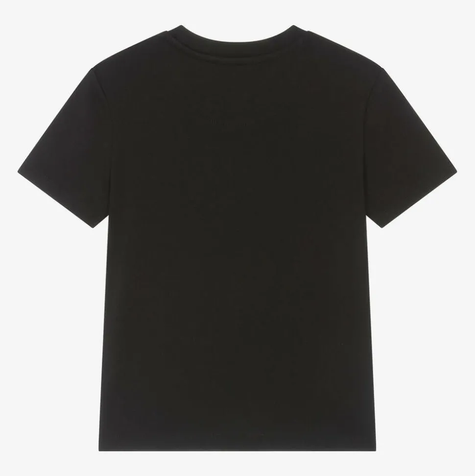 Black short-sleeved T-shirt for little boys and girls by Calvin Klein, made from soft cotton jersey. Great for a casual and laid-back look, it is printed with a white and grey Calvin Klein monogram for an iconic finish.