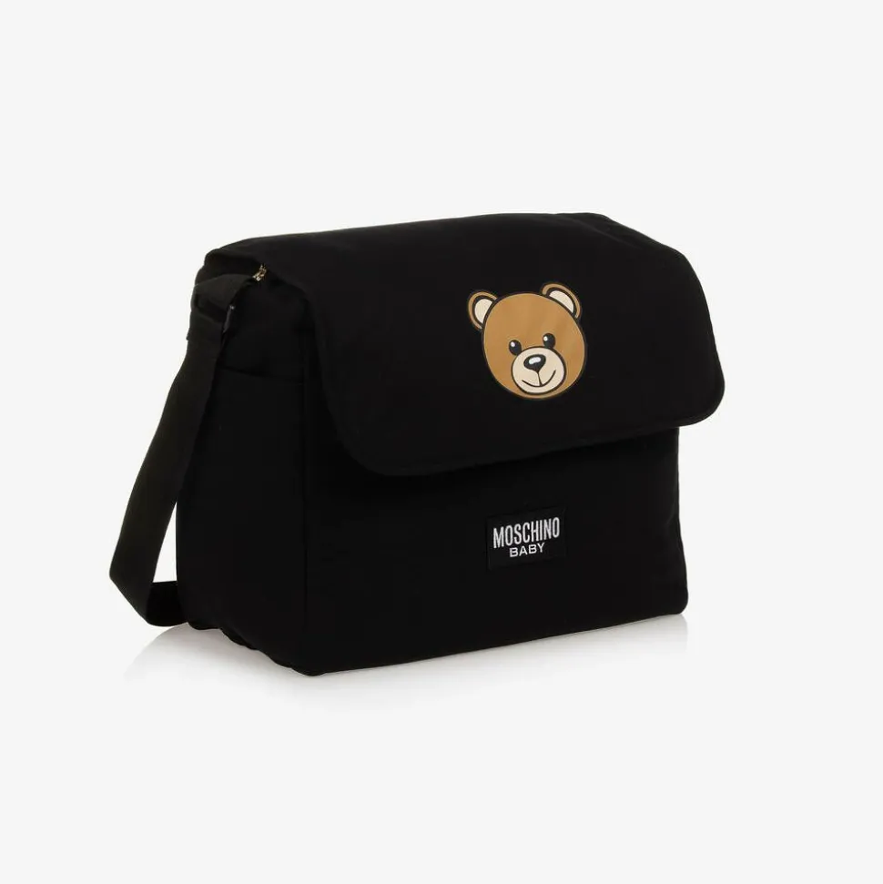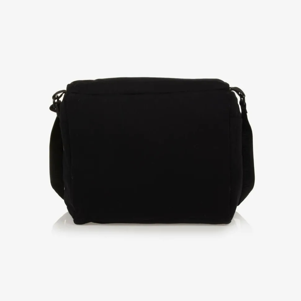 Black changing bag by Moschino Baby, printed with an iconic Moschino Teddy Bear logo on the front. Made from soft cotton jersey with a smooth lining and mid-weight padding, it has a black adjustable strap with branded jacquard detailing. The spacious main compartment has four useful pockets inside and comes with a matching logo-detailed changing mat. Fastening with a zip and velcro tab, this cool style has useful pockets on the sides and is finished with a black logo patch.