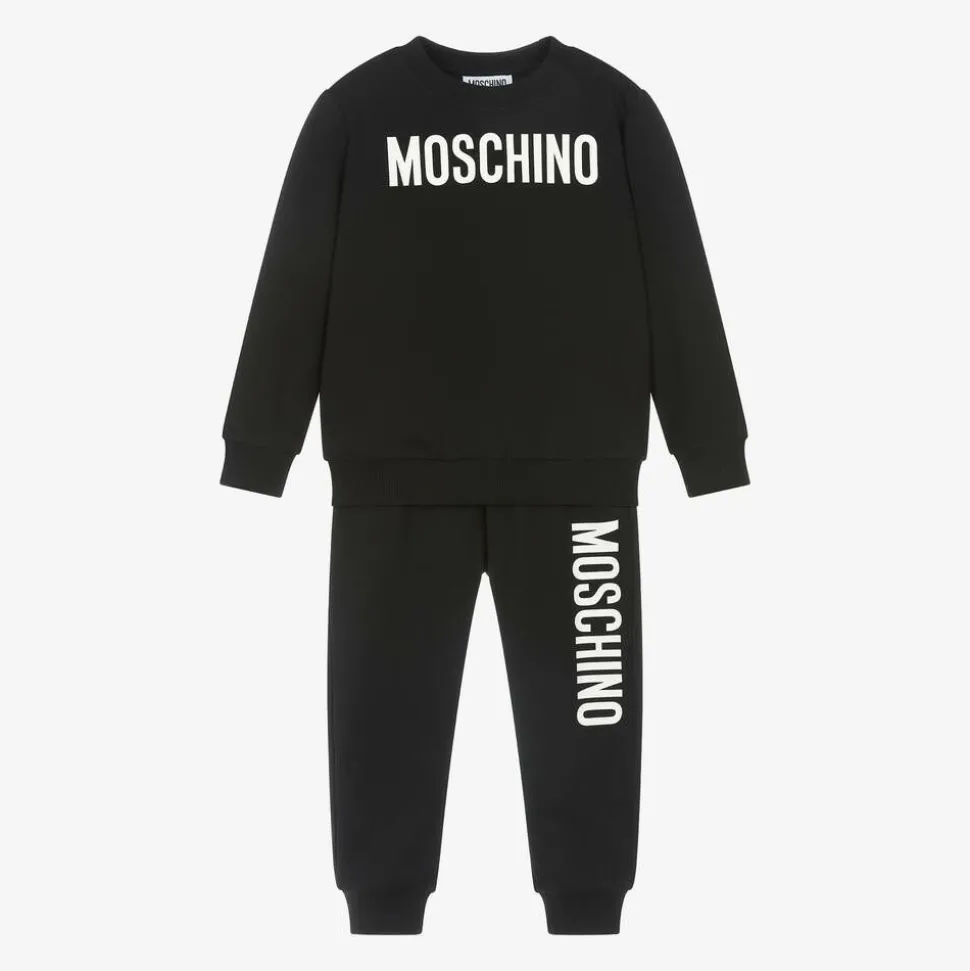 Black tracksuit for boys and girls by Moschino Kid-Teen, with bold white logo prints. Casual and comfortable, it is made in soft cotton jersey with a cosy fleecy inside. The trousers have useful side seam pockets, an elasticated waist, and cuffed ankles.