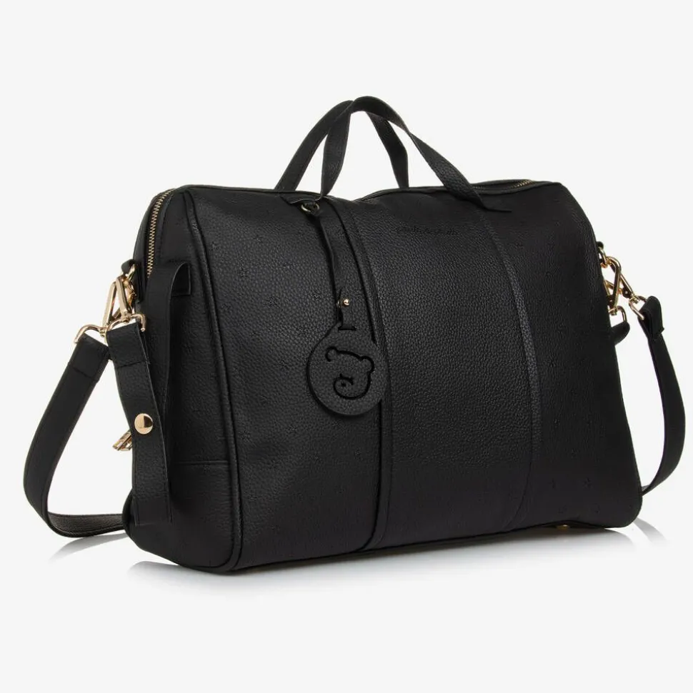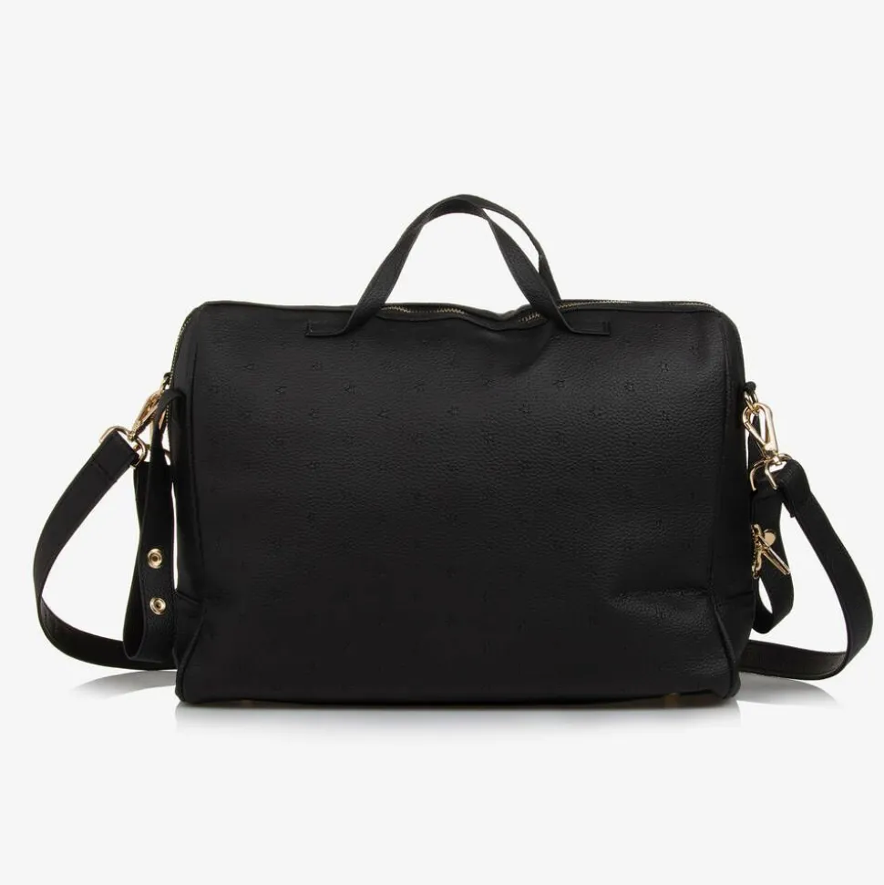 Black faux leather baby changing bag by Pasito a Pasito, with gold-tone hardware and a subtle teddy logo charm. Made without harmful substances or dyes, the bag is lightweight and spacious, with interior pockets to travel easily with baby's essentials. There are carry handles, a clip-removable shoulder strap and two detachable stroller straps. Unfastening with a zip, inside is a laminated pocket with a zip for the storage of wet clothing. The bag is embossed with a star pattern and includes a handy changing mat.