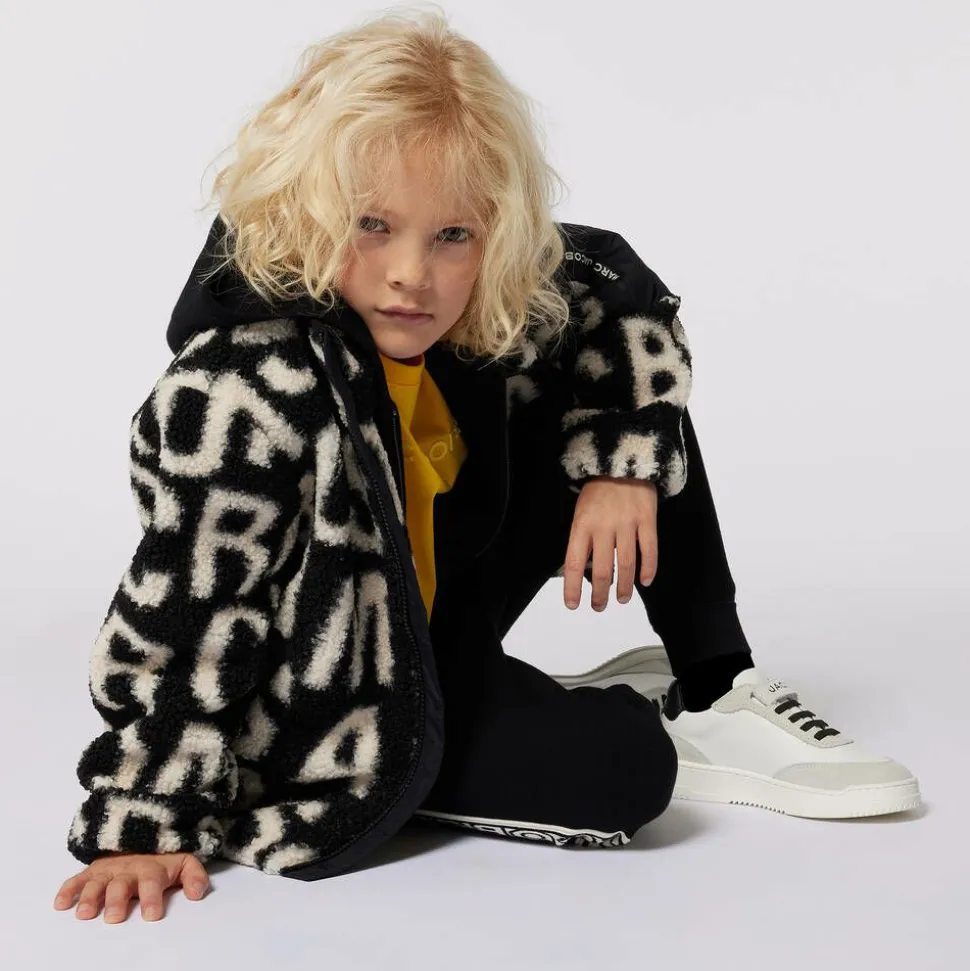 Black and ivory zip-up top for boys and girls by MARC JACOBS. A statement look, the sherpa fleece fabric bears the label's distinctive jumbled logo pattern. Lined with cosy polar fleece and lightly padded, it has a branded zip-up pocket on the sleeve, a stand-up collar, and popper-closing front pockets. It fastens with a logo-engraved zip on the front for that extra touch of branding.