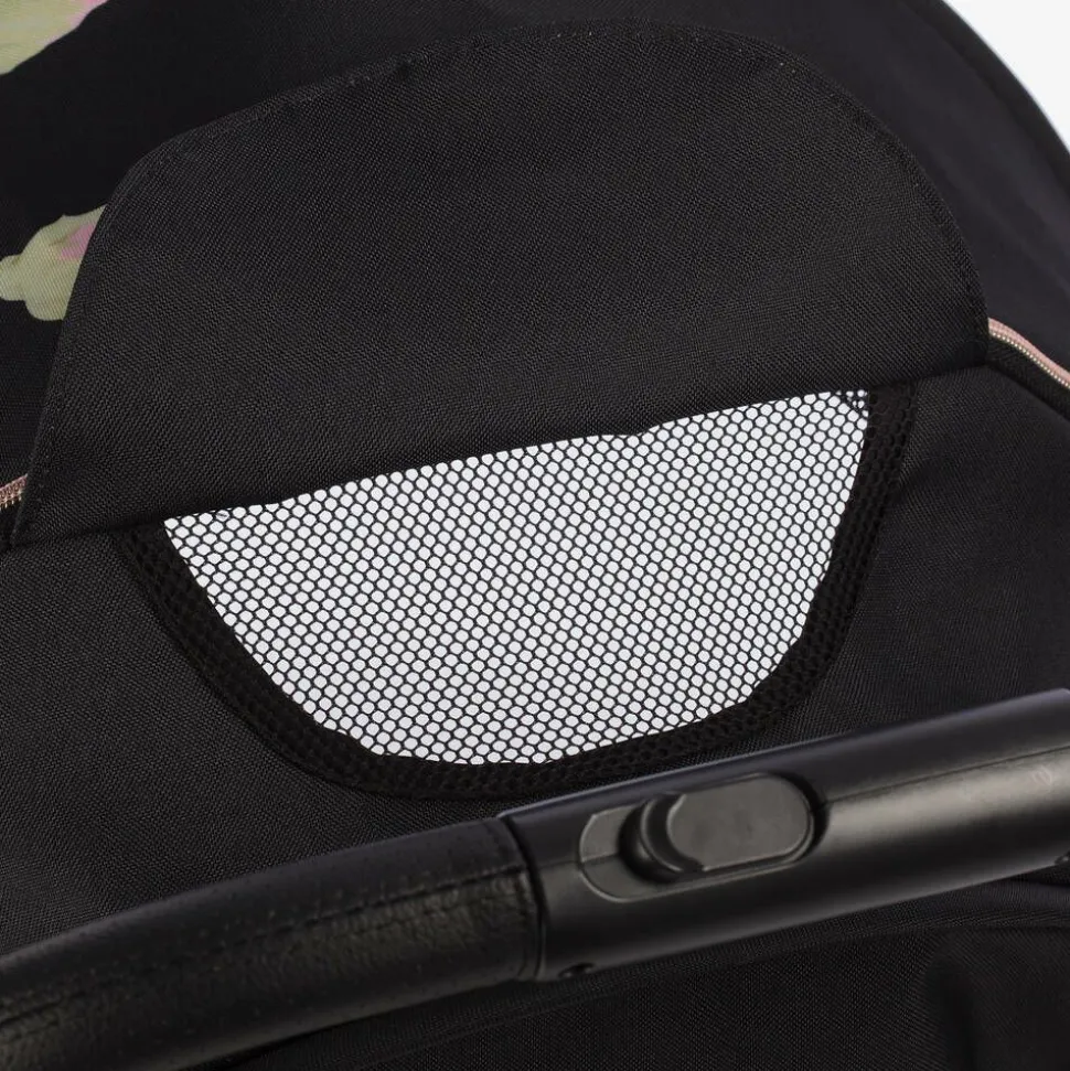 A stylish black stroller by Monnalisa, designed in collaboration with Leclerc Baby. Iconic of the brand, it has a pretty pink and green floral pattern, with a glossy metallic pink frame and Monnalisa embroidered on the canopy. Practical and convenient, this attractive stroller is expertly designed with an easy one-hand folding mechanism, three flexible seating options and a spacious under-seat basket offering easy storage underneath. Maintaining maximum safety, it has a five-point magnetic buckle, an adjustable footrest and a removable bumper bar. The extendable sun canopy with 50+ SPF, features a pink zip that reveals a ventilated mesh window for breathability.