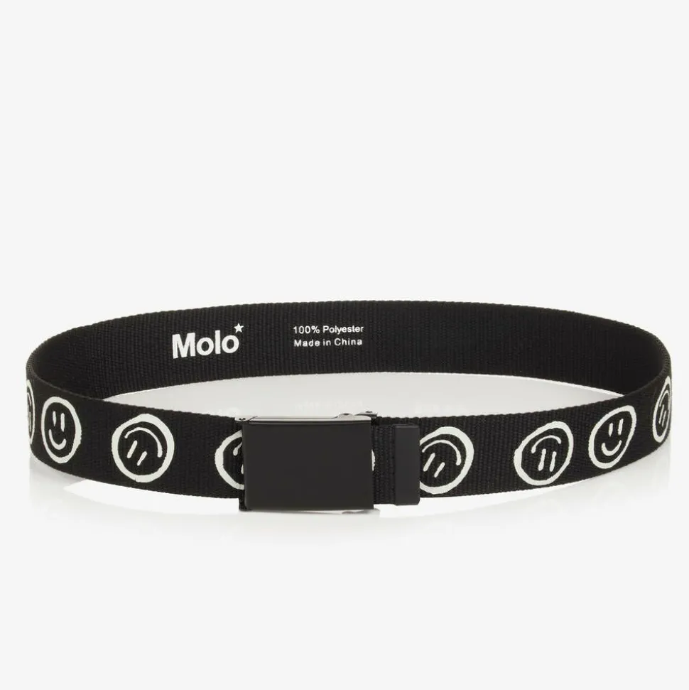 A black woven belt for boys and girls by Molo. It is printed with white happy faces for a fun look, and has a black clasp fastening on the front for an adjustable fit.