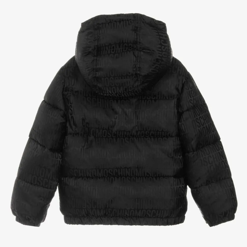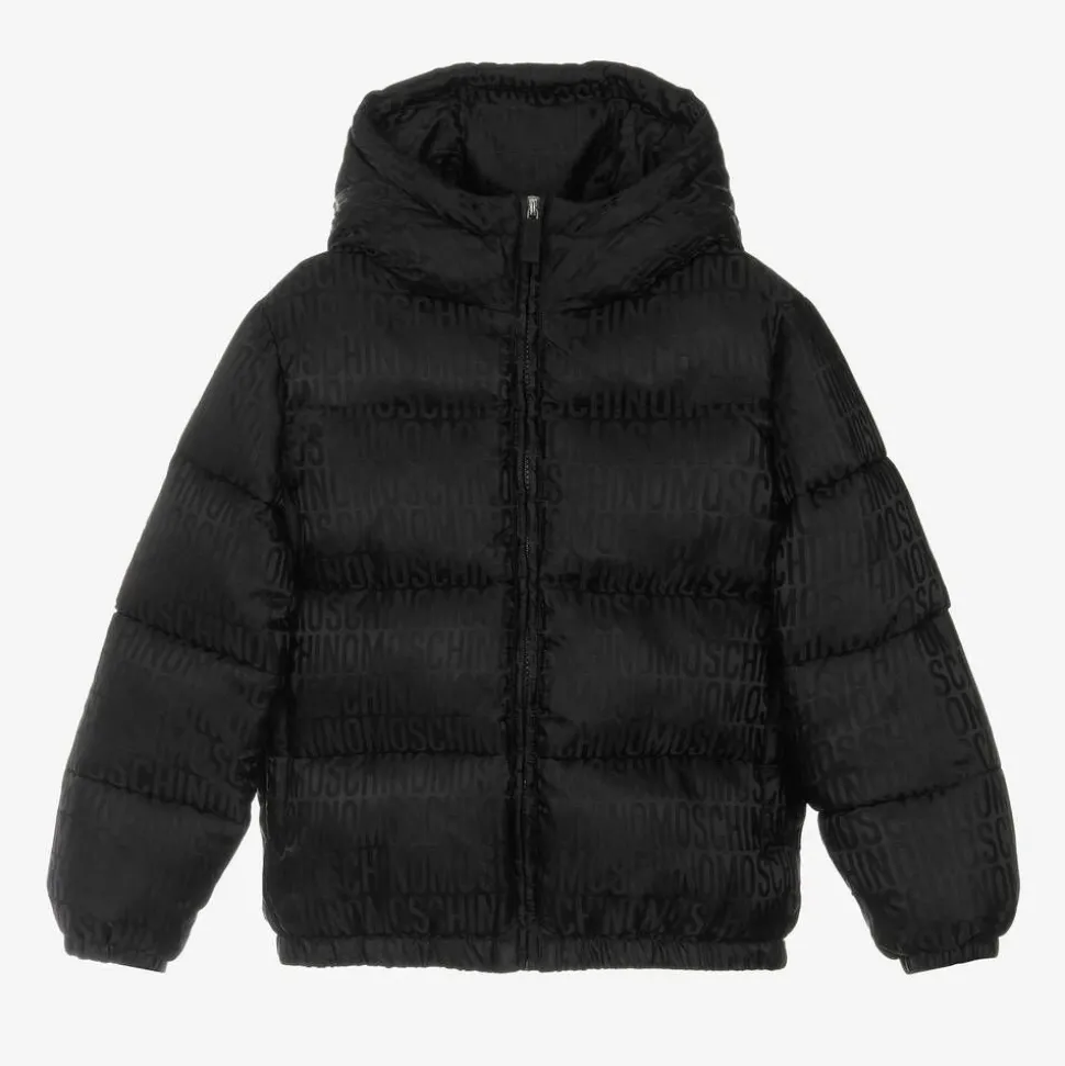 A cool black puffer jacket for boys and girls by luxury brand Moschino Kid-Teen, patterned with all-over tonal jacquard logos. Silky smooth with mid-weight padding, it is warm and practical, with a high neck, a cosy hood and fleece-lined pockets. The hemline and cuffs have elasticated trims to keep the elements out.