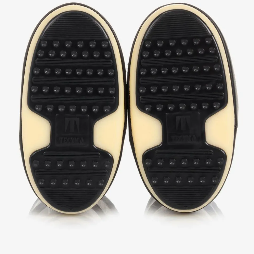 Black snow boots for boys and girls by Moon Boot, with a white logo print panel for a bold, branded look. Heavily padded and ultra resistant in the original style, they feature a two-tone thermoplastic sole with little suction pads at the bottom for improved grip. They have faux leather trims, a stylish lace-up look and a drawstring ties on the ankles to lock in warmth. The technological foam lining will feel snug at first but will mould to the size and shape of the foot after a few hours of wear.
