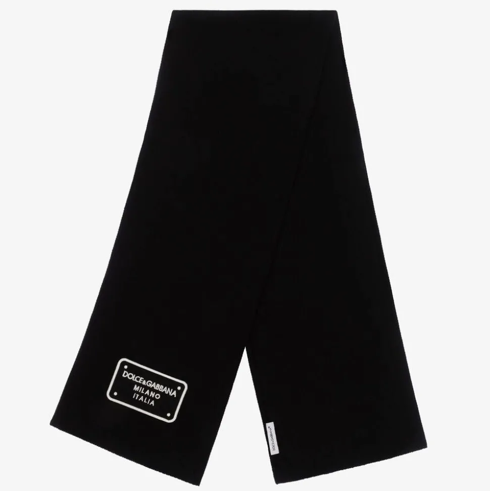Black scarf for boys and girls by Dolce & Gabbana, the luxury Italian designer. This cool accessory is knitted in the finest virgin wool for a beautifully soft feel. Statement monochrome branding accents this cold-weather style.