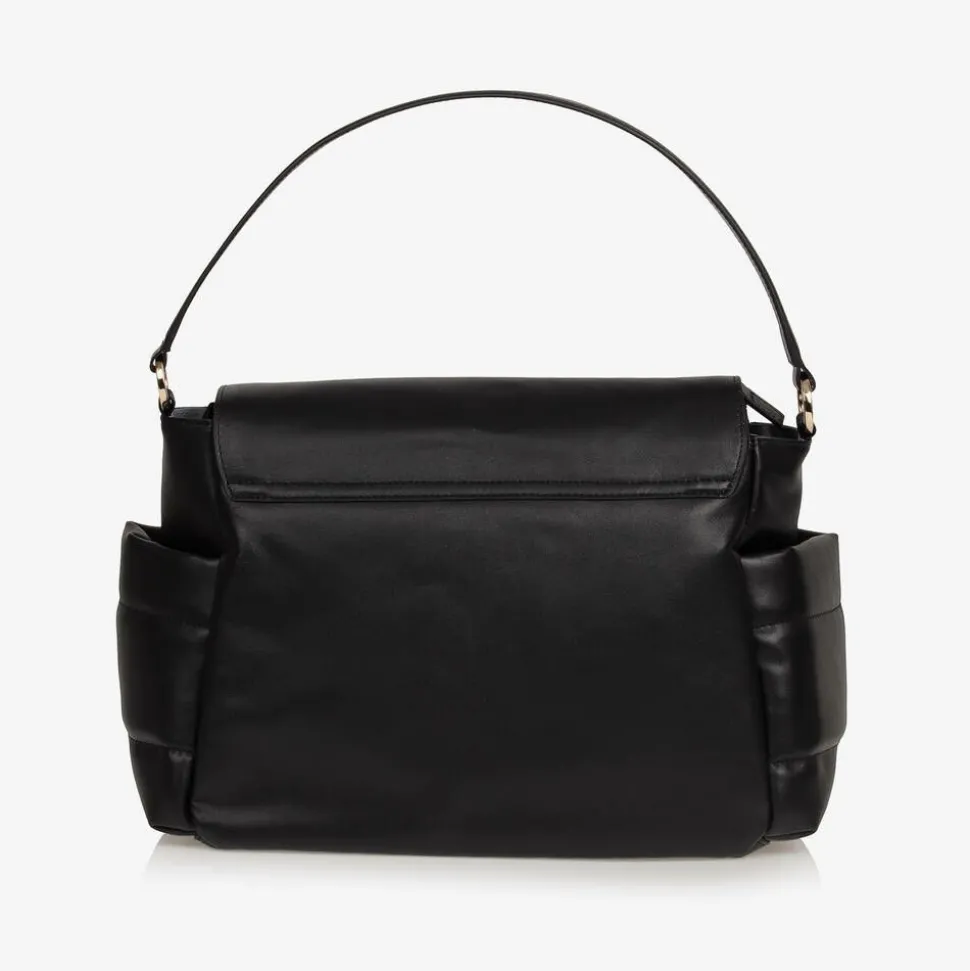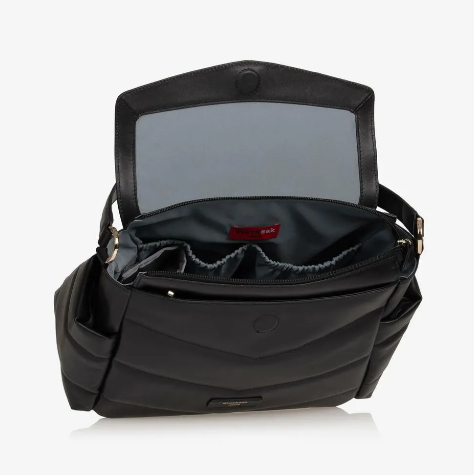A stylish black leather changing bag by Storksak, with a beautiful smooth feel and quilted detailing. Branded on the front, this versatile design has a spacious compartment with a zip opening and a magnetic flap cover. The lined interior features two elasticated pockets and an insulated sleeve that secures inside with velcro. There are two side pockets for bottles and a discreet zip pocket on the front for storing valuables. This sleek design is styled with a leather shoulder strap and comes with a long detachable strap. This has convenient velcro stroller straps built in for practicality.