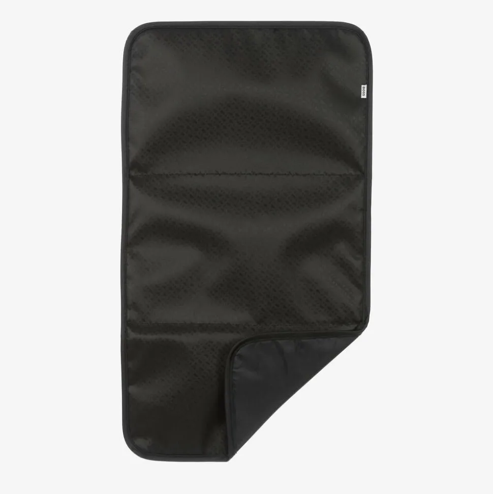 Inspired by the adult collection, this stylish black changing bag by BOSS features the German brand's monogram logo pattern. For added designer appeal, there is a white logo print and signature stripes on one side and the adjustable jacquard shoulder strap is woven with repeat logos. The spacious main compartment has a silky lining, mesh pockets and a zip fastening. There are further convenient external pockets, ideal for organising belongings. For versatile carry options, it has fixed handles on the top and detachable, clip-fastening stroller straps. It comes with a matching, padded changing mat for outings.