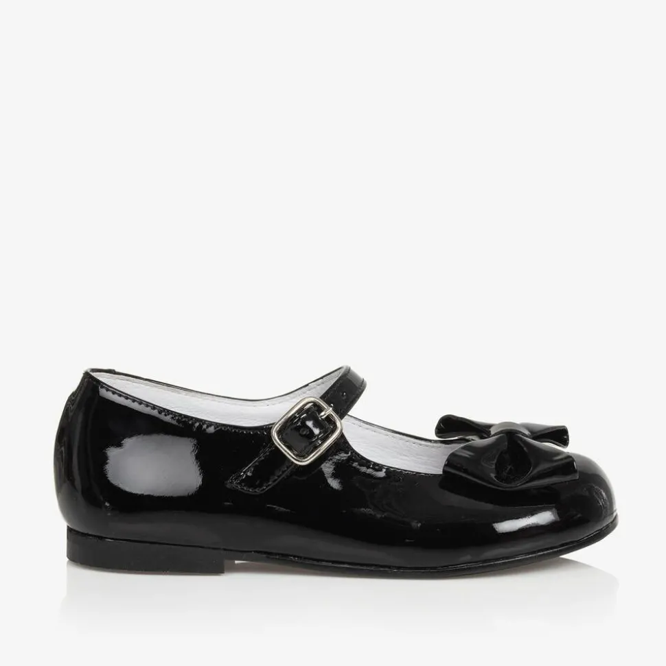 Exclusive to Childrensalon, a pair of smart black patent leather shoes for girls by Children's Classics, with bow details on the front. This timeless design has a soft leather lining, padded insole and adjustable buckle fastening .