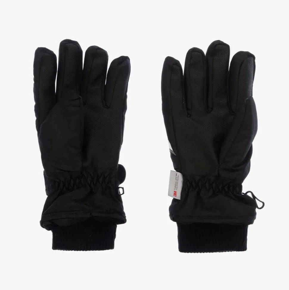 Black ski gloves for boys and girls by Playshoes, with reflective trims. Warm but lightweight with 3M Thinsulate⢠insulation, they are waterproof and breathable. Lined in soft, warm fleece, they have comfortable ribbed cuff, adjustable velcro straps and hard-wearing, slip-resistant palms.