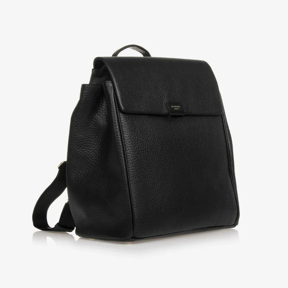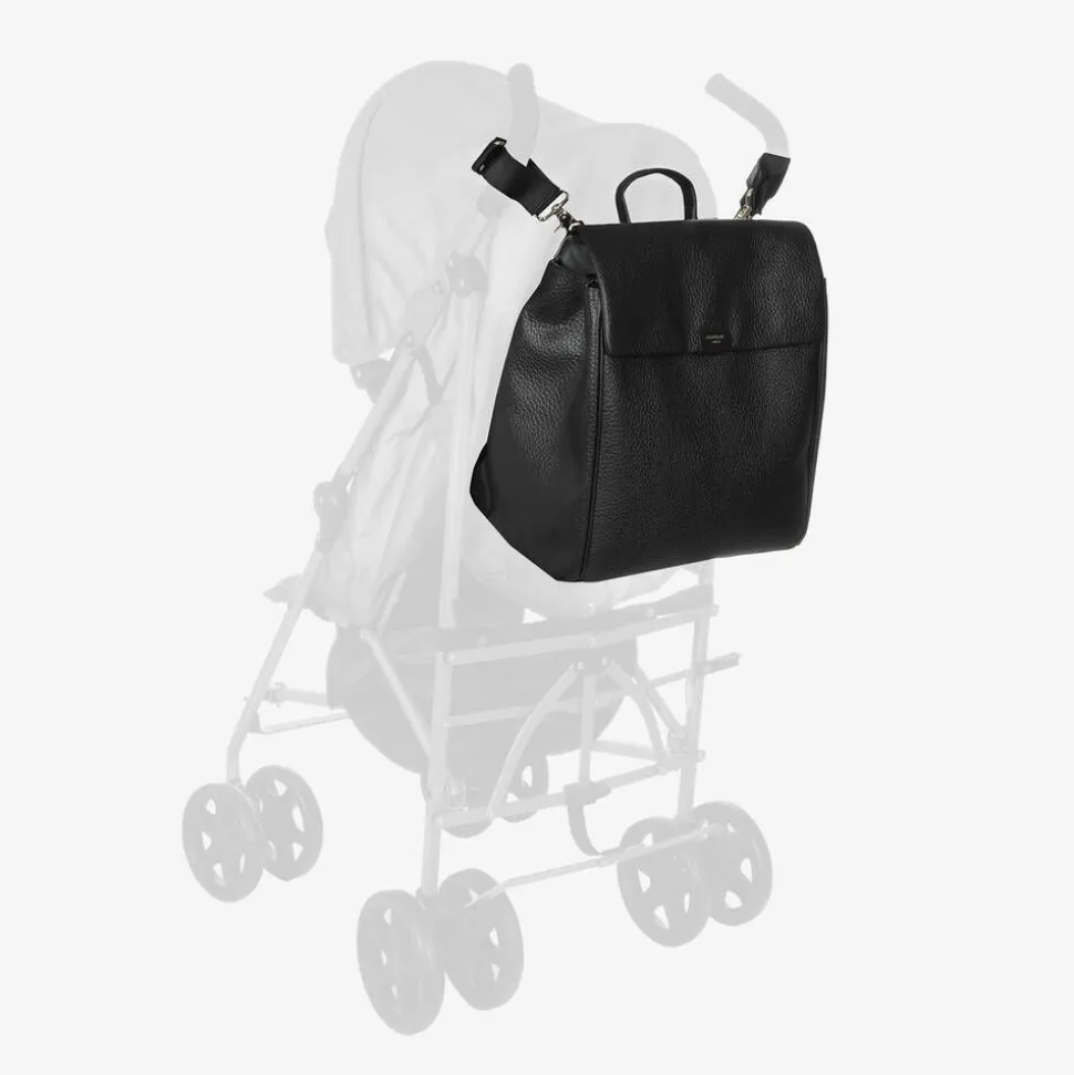 Black grained leather changing bag by Storksak, with stylish gold accents. The spacious main compartment fastens with a smooth zip, and contains elasticated and zip pouches for extra organisation. It comes with an easy-to-clean changing mat to help with changing baby on-the-go. Included are a pair of clip-on stroller straps to attach to your buggy or pram for versatile wear. The adjustable shoulder are adjustable for a great fit. There are discreet zip fastening pockets on the sides for small essentials. A gold embossed logo can be seen on the front, completing this practical baby bag with a stylish, branded touch.