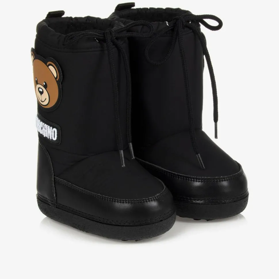 Black pull-on snow boots for boys and girls by Moschino Kid-Teen. The Moschino Teddy Bear rubberised patch can be found on the side with logo patch embroidery beneath. The calf-length textile shaft can be fastened with the drawstring to keep feet dry, warm and cosy. They are lined with super soft and snuggly fleece for added warmth. The rubber soles have textured treads to improve grip on slippery and wet surfaces.