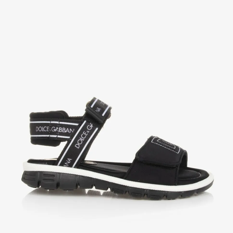Black sandals for boys and girls by luxury Italian designer, Dolce & Gabbana. Made in soft textile, they have the signature crossover DG logo embroidered across the velcro fastening strap. The ankle strap is lightly padded on the back for support, fastens with easy-to-use velcro and has a jacquard logo design for a sporty, modern look. The soft fabric insole is gently cushioned for comfort, and completed by an embossed leather logo patch.
