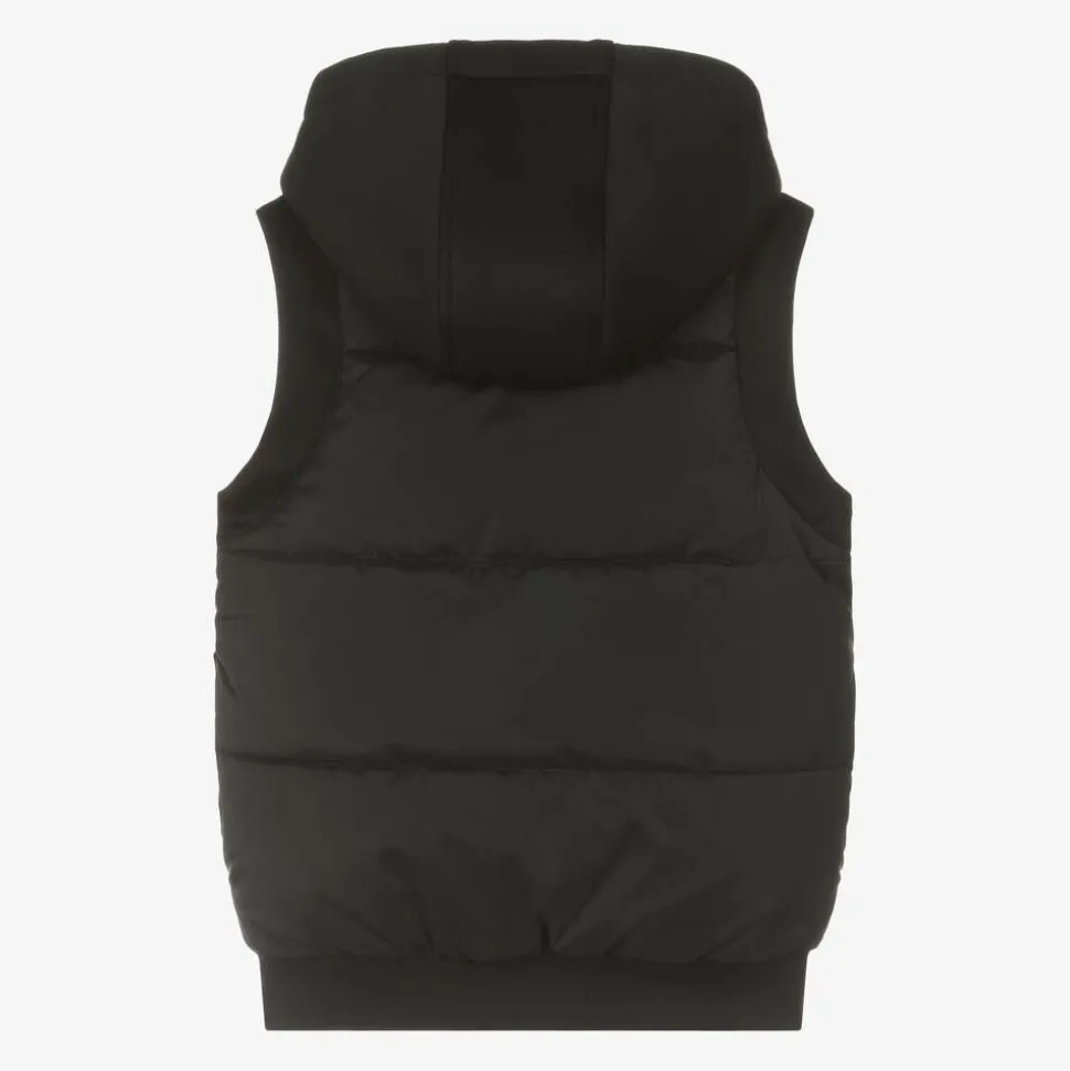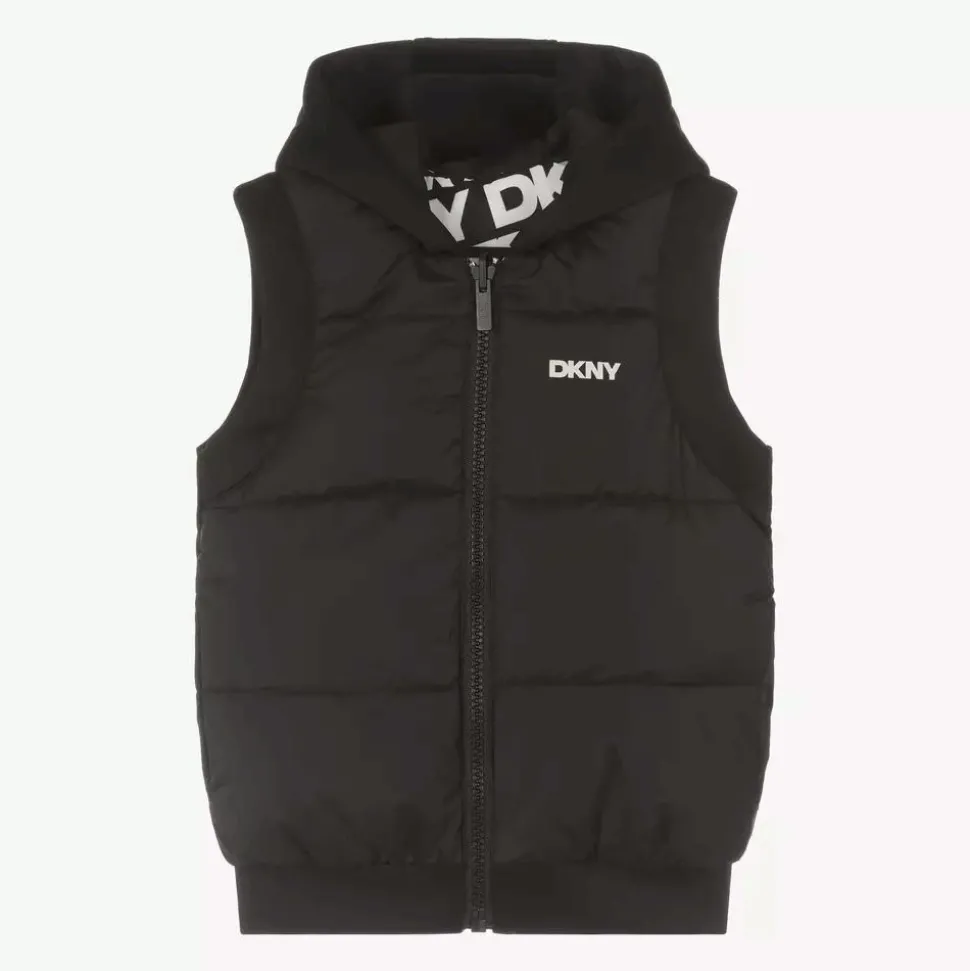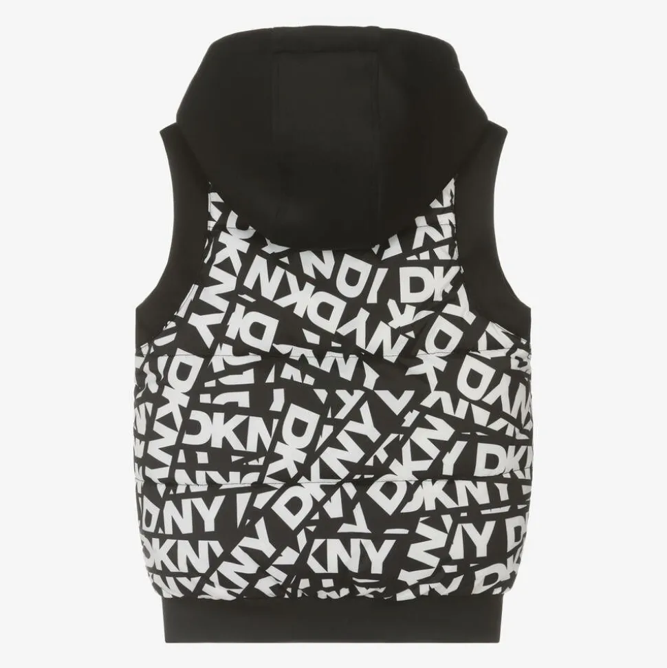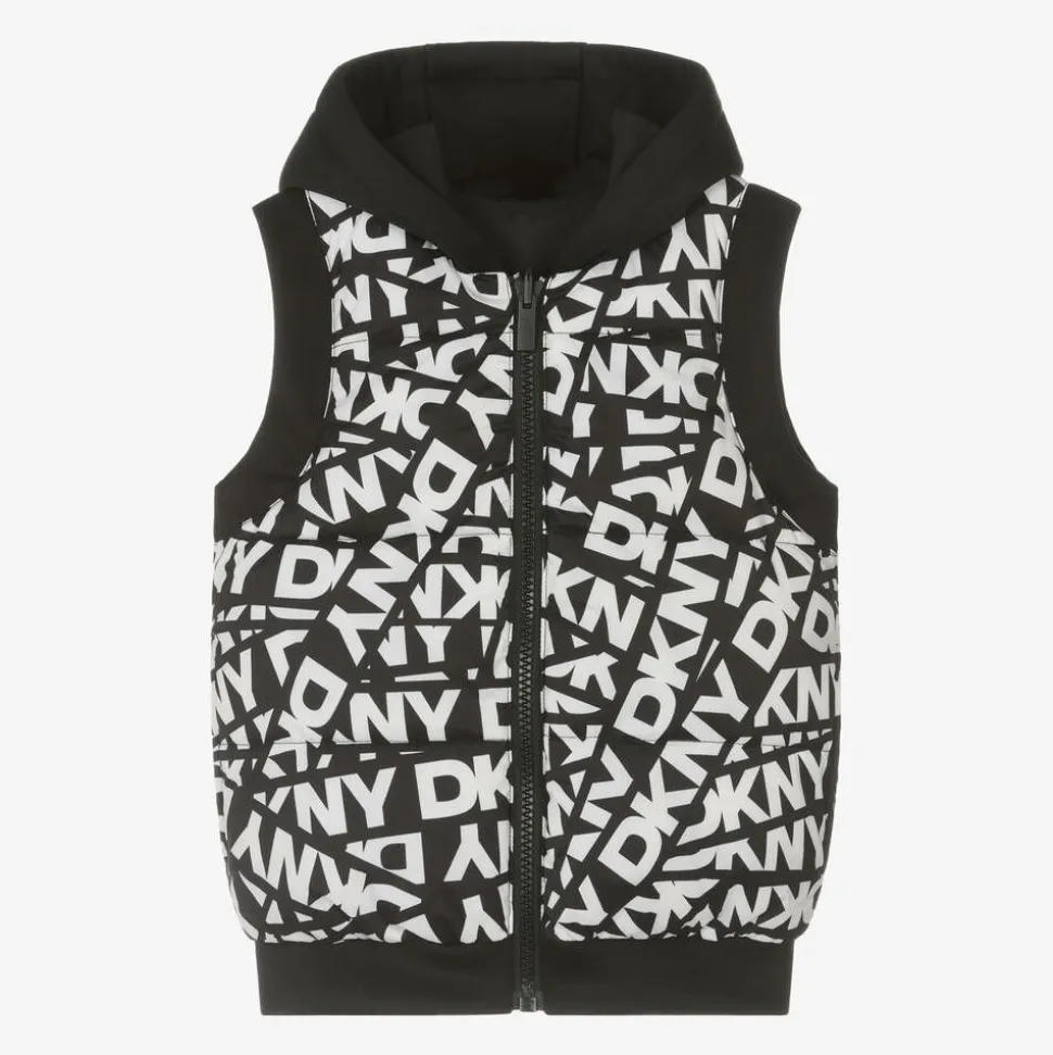 A stylish black and white reversible hooded puffer gilet for boys and girls by DKNY. Padded for warmth, this cool design is patterned on one side with a monochrome graphic logo print for instant designer recognition. The reverse is plain black, with subtle branding on the chest. There are useful pockets on both sides and it fastens easily with a chunky zip.
