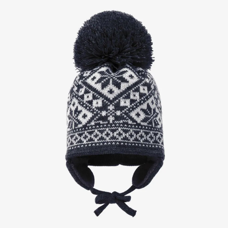A navy blue knitted beanie for little boys and girls by Sätila of Sweden, with an ivory Fair Isle pattern. A cosy classic for colder days, it has protective ear flaps with ties fastening neatly under the chin. A large pom-pom is decorated on top to complete the look.