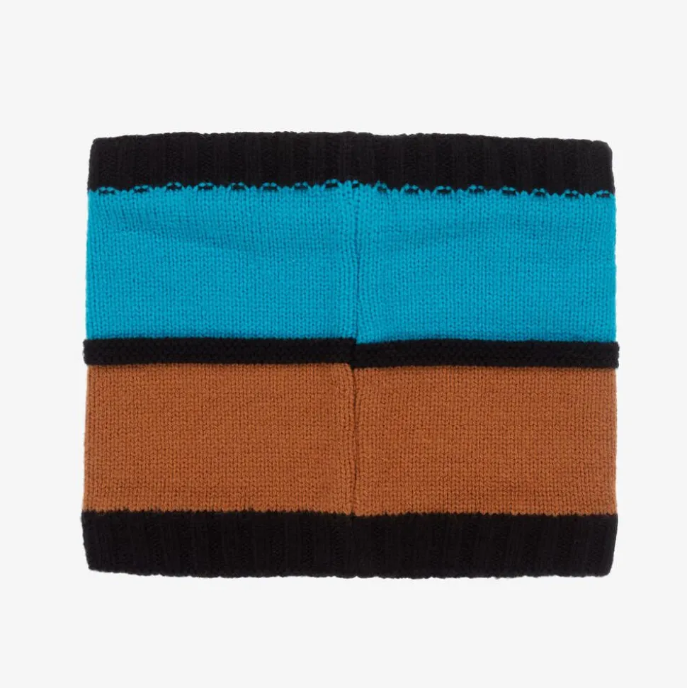 Blue and brown snood for boys and girls by Deux par Deux, made in a soft knit. Lined in soft polar fleece, with black ribbed trims, this warm and cosy accessory has a cool, reflective logo patch on the front.