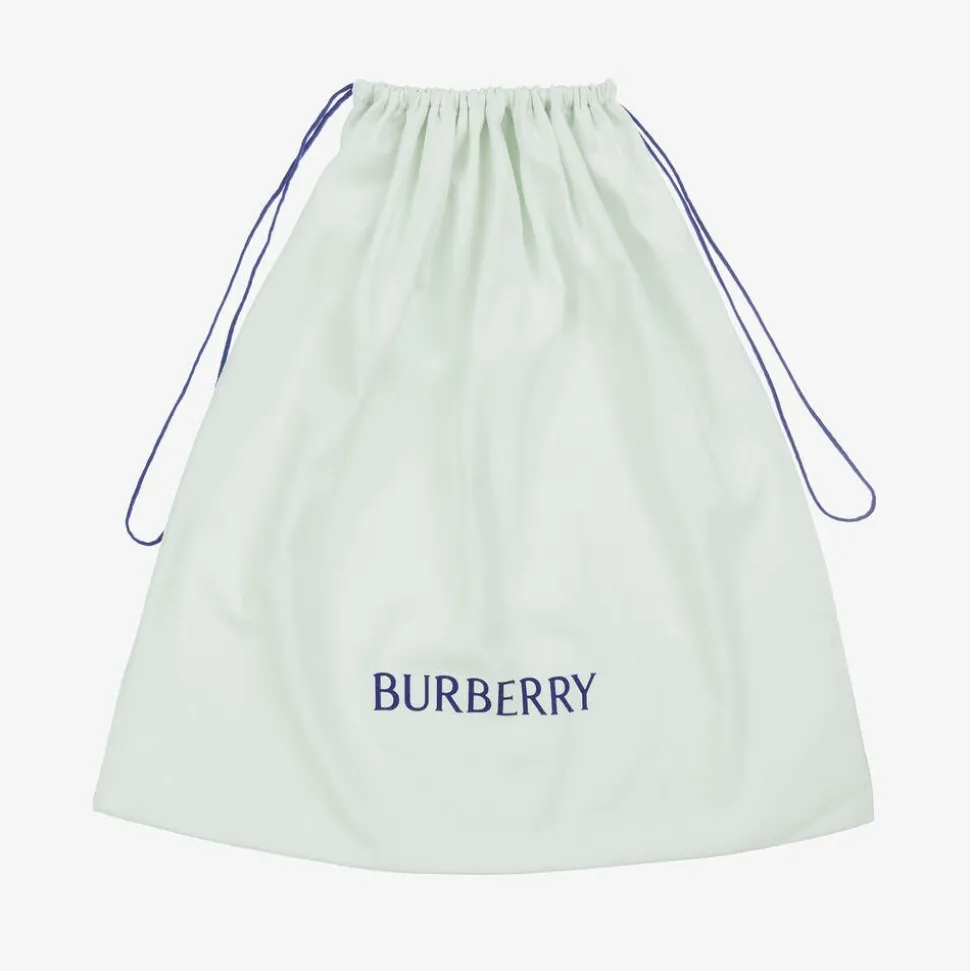 Stylish backpack for boys and girls by luxury British brand Burberry. Made in slightly ridged and durable fabric, it is patterned with the designer's signature check in light blue and beige for a new take on the classic design. For comfort, there is a quilted black back panel, with a leather-trimmed name plate, and padded, adjustable shoulder straps. The front pocket has a sturdy velcro fastening, and the two side pockets have elasticated openings to secure bottles. The large main compartment has three, leather-trimmed, internal slip pockets, a silky lining and fastens with a zip. There is a further zipped pocket behind the main compartment and a useful canvas carry handle. This item contains at least 50% recycled material.