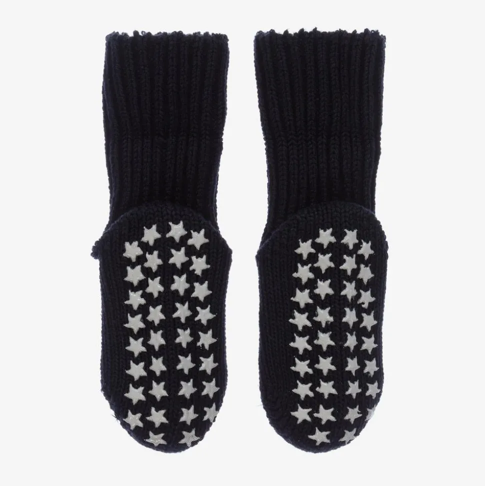 Navy blue slipper socks for baby boys and girls by Falke, durably knitted in a soft cotton blend. Ergonomically designed, these socks are cushioned to comfort little feet, with folded ankle cuffs for added cosiness. The soles are finished with rubberised non-slip pads, supporting your little one as they take their first steps.