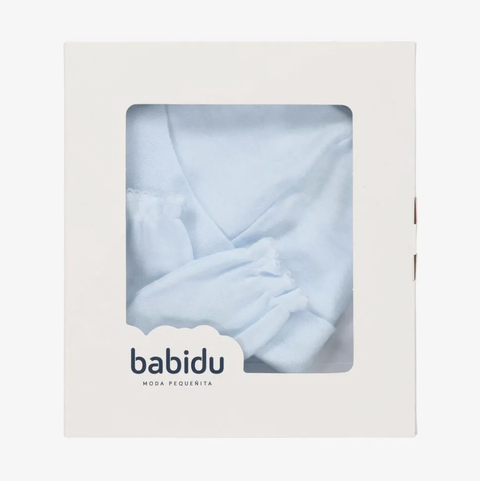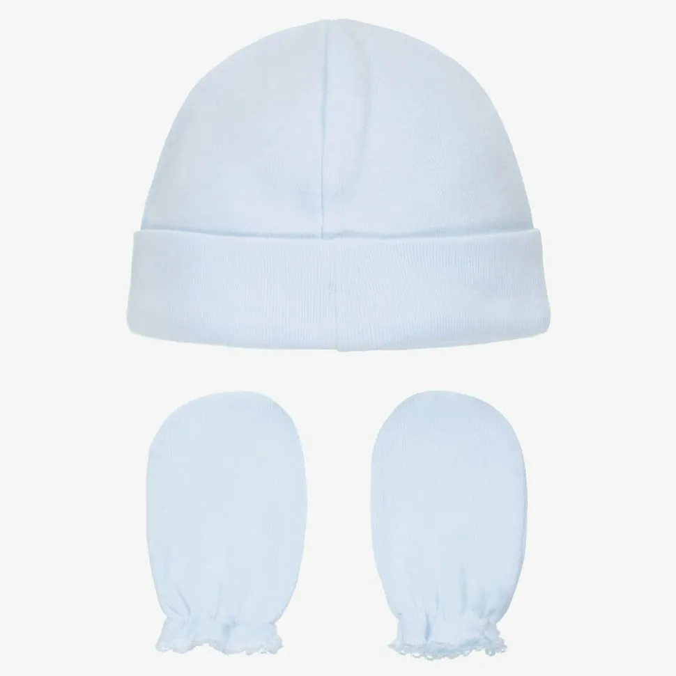 Blue two piece hat and mittens set by Babidu, for baby boys and girls. The hat is made in a double layer of stretchy cotton jersey with a turned-up brim. The matching scratch mittens are elasticated on the cuffs with delicate scalloped trim.