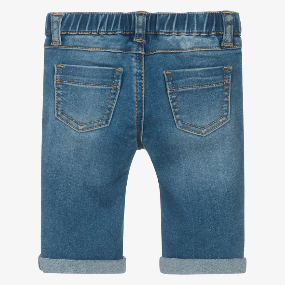 Mid-wash blue jeans for little boys and girls by luxury Italian brand Moschino Baby. In a five-pocket style, they are made in soft, stretchy denim for comfortable wear. They have a gently elasticated waist and fasten with a branded gold-tone popper on the front. For instant designer recognition, the iconic Moschino Teddy Bear badge is on the front, with a branded tab on the coin pocket.