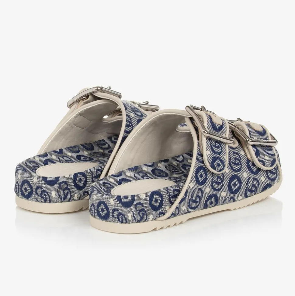 Stylish blue canvas sandals for boys and girls by the luxury Italian brand Gucci. They are patterned with the brand's Double G geometric jacquard and trims with grey leather piping. For a better fit, they have two adjustable straps which fasten with branded chunky silver buckles. The ribbed non-slip outer soles have been embossed with the iconic Interlocking G.